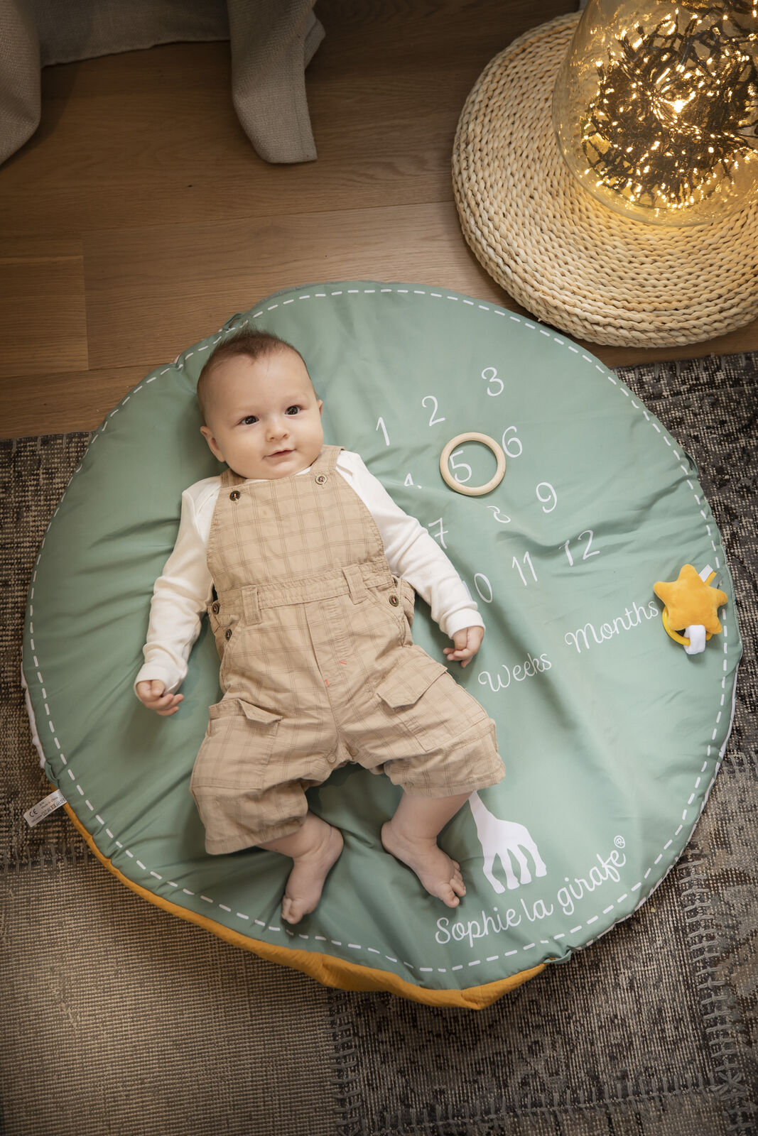 Втора страна: От едната страна са написани числа, думата "месеци" и "седмици" и има и лицето на Софи. Поставете отметка върху месеца или седмицата на вашето бебе и усмивката на Софи върху правилната дума, поставете вашето бебе до тях и направете най- красивите снимки за спомен. Така можете да проследите със снимки развитието на бебето всяка седмица и месец и да направите най-красивия бебешки албум!