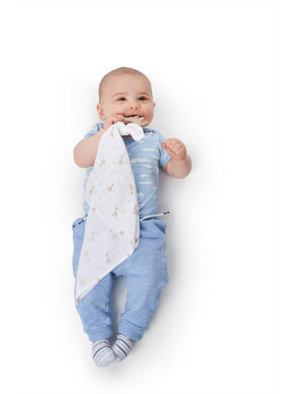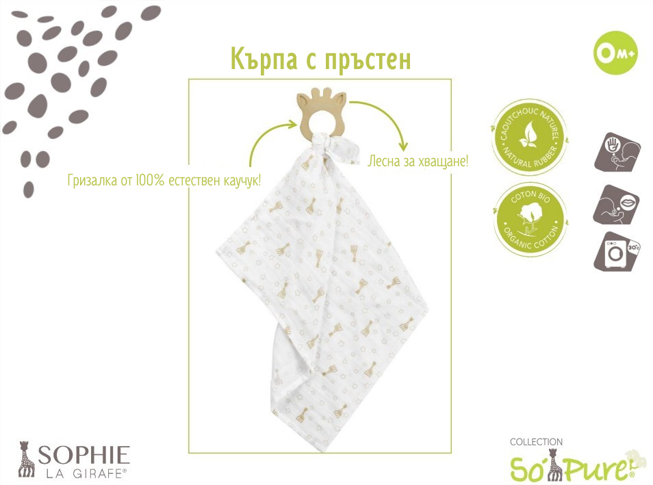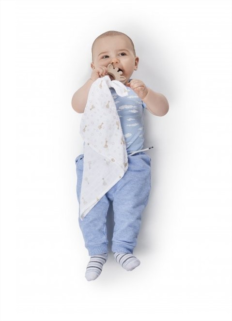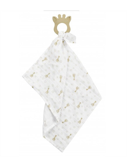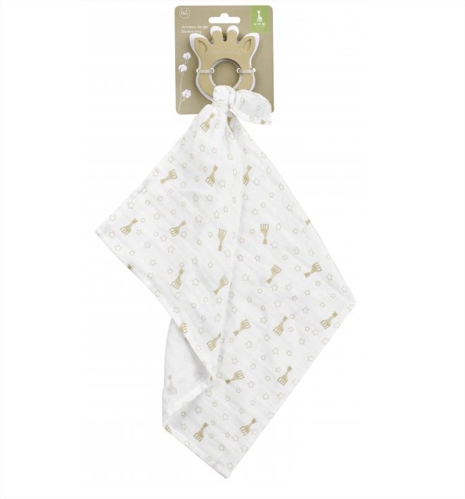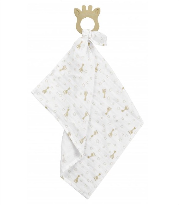 Удобна пелена/утешител на Жирафчето Софи, заедно с пръстена за зъби, е идеалният спътник за вашето беб по всяко време на деня!