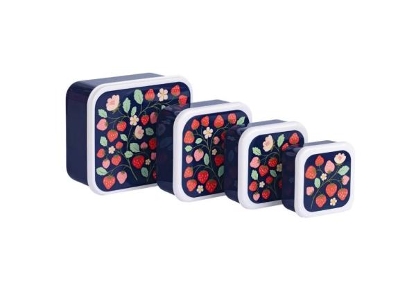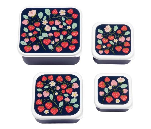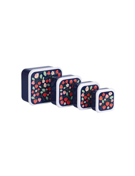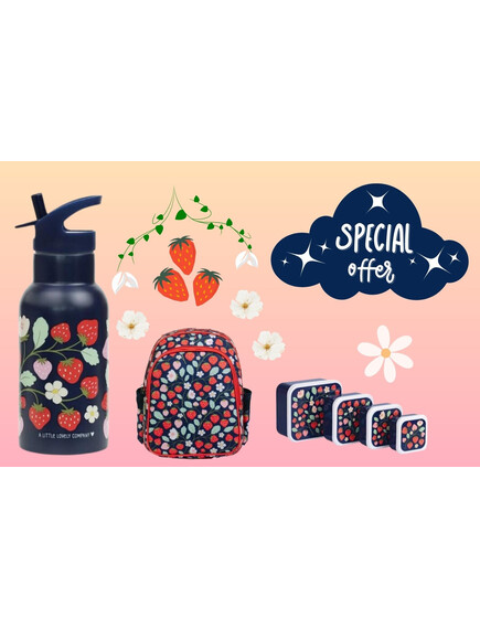 A Little Lovely Company Combo Ягодка: Бутилка от неръждаема стомана със сламка + Раница с изотермичен джоб 27 x 32 x 19 cm + Комплект кутии за храна