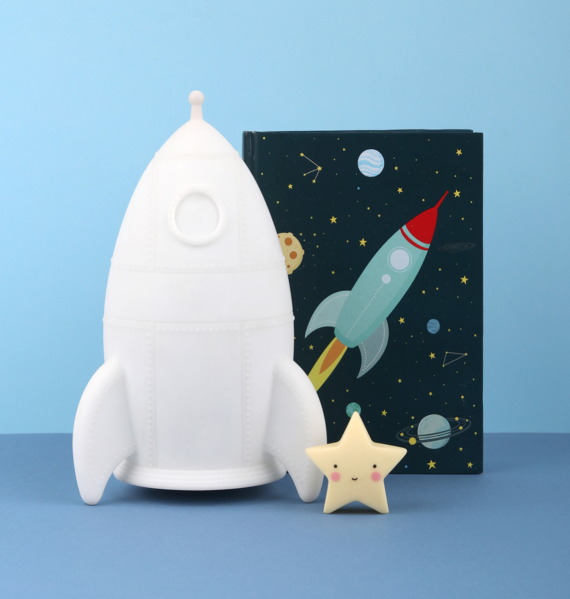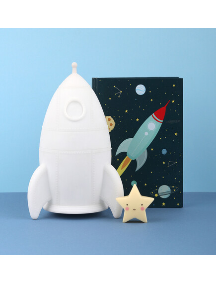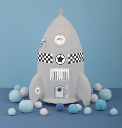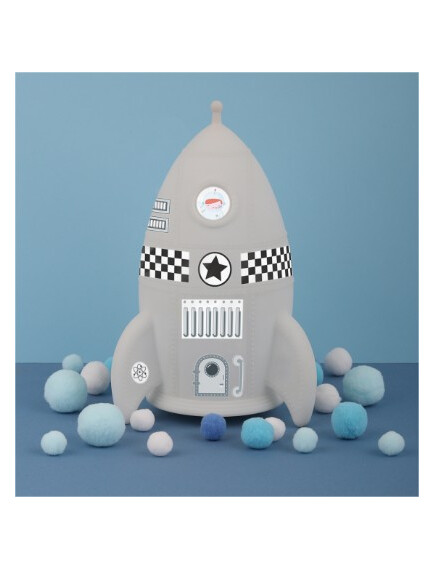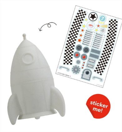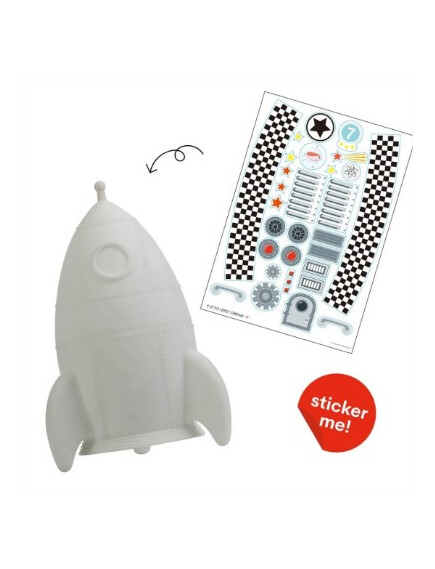 Вие и Вашият малък астронавт можете да направите свой собствен дизайн на ракетата с включените в комплекта стикери. Светлината се изключва автоматично, след настройка на таймера за 15 минути. Вашето малко ще заспи сладко с меката светлина на любимата ракета.