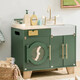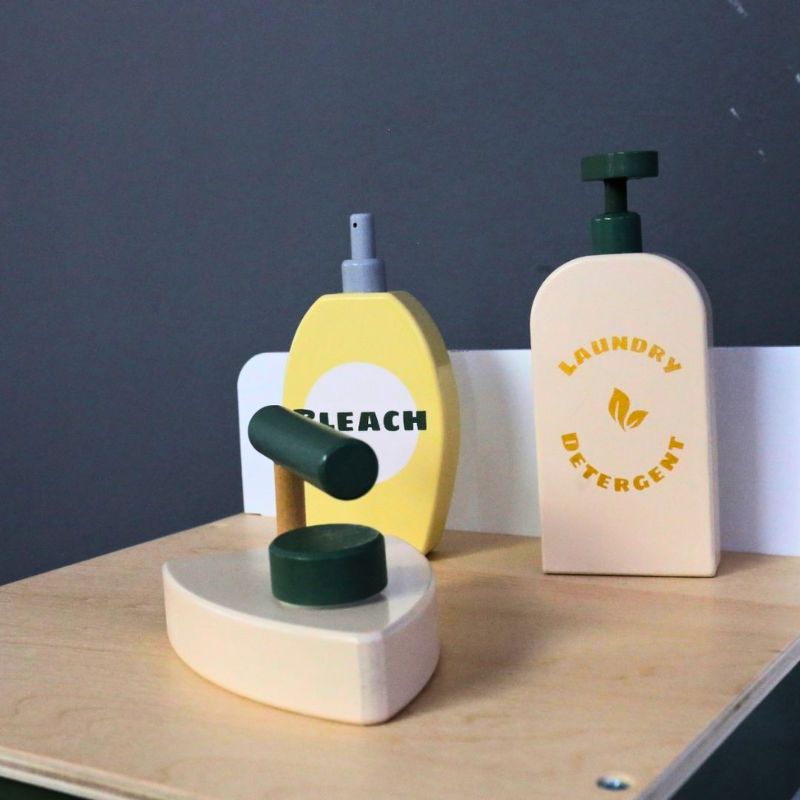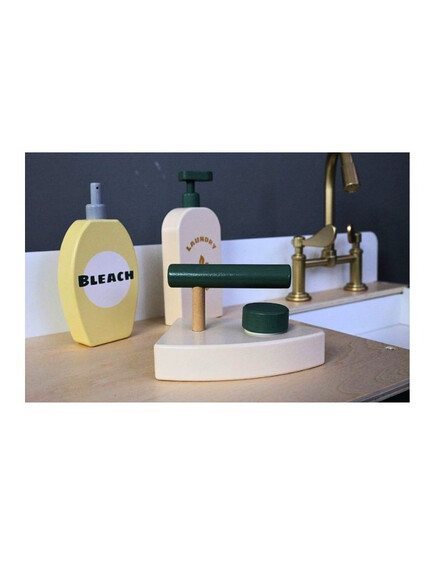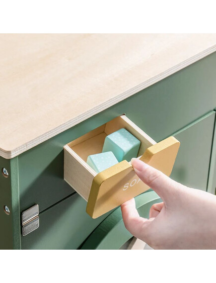 Изработен е от здраво дърво, с подходящ размер и практични шкафчета, за да може детето да съхранява всичко необходимо за пране или гладене на дрехите си.