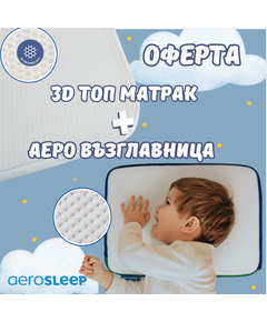 Топ матрак + Възглавница AeroSleep Максималнa безопасност и комфорт за съня на Вашето дете! Осигурете на детето си спокоен, здравословен и безопасен сън с комбо пакета AeroSleep , включващ топ матрак и възглавница , проектирани с иновативна 3D технология тип „пчелна пита“ . Тази...