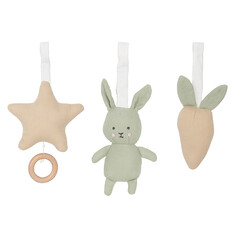 Сладки и много меки играчки за бебешка гимнастика. Може да закачите на всякъде. Комплектът включва морков, зайче и звезда.  Звездата пуска приспивна мелодия, а зайчето има дрънкалка вътре, която създава интересен звук за бебето. Формите и цветовете на играчките...