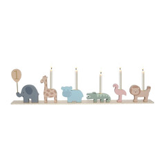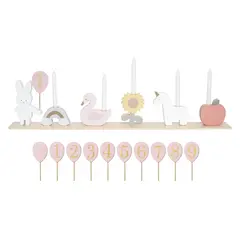 Ще използвате тази декорация от първия до деветия рожден ден на детето! Всяка година поставяте числото, което представлява възрастта на детето, в слончето :)  Разбира се, детето може да духне свещите на фигурките всеки път!  Комплектът включва: Дървена...