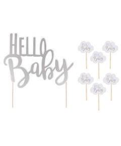 Перфектни за декорация на торти и сладкиши за парти по посрещане на бебе.  С тази украсата всяка храна ще изглежда по-специална и тематична!  Идеална за babyshgower със сребърния си надпис  Hello Baby ( Здравей, бебе)  Комбинирайте с...