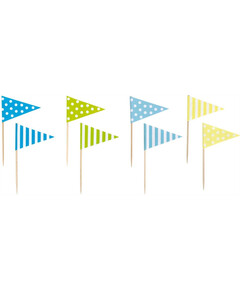Флагчетата на клечки в красиви цветове и дизайни, идеални за детски партита и бейбишауър. Украсета торта или мъфени с тези знаменца и те мигновенно ще превърнат вашата маса в специална. Размери 16 * 9см Пакетът включва 16 броя.
