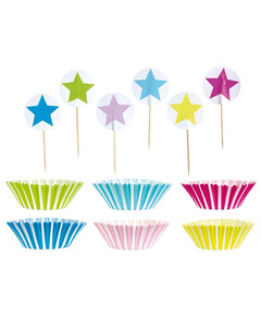 Перфектни формички за кекс в красиви цветове,  идеални за детски партита и бейбишауър. Този продукт със сигурност ще направи вашата маса специална! Опакоката вкючва 24 броя формички и 24 клечки.