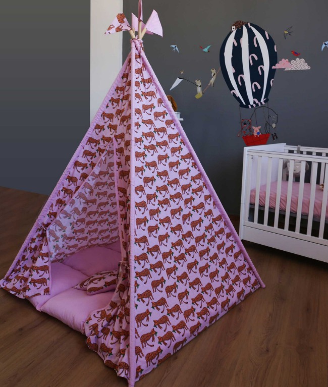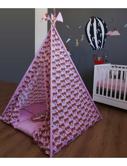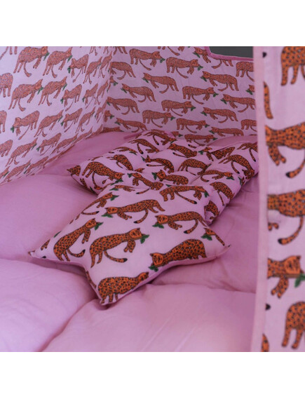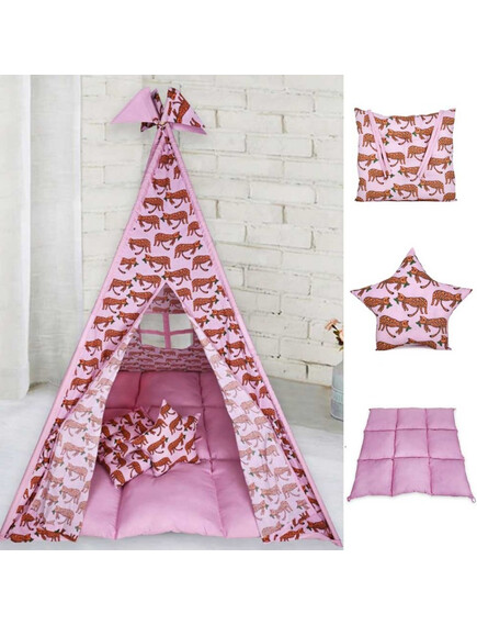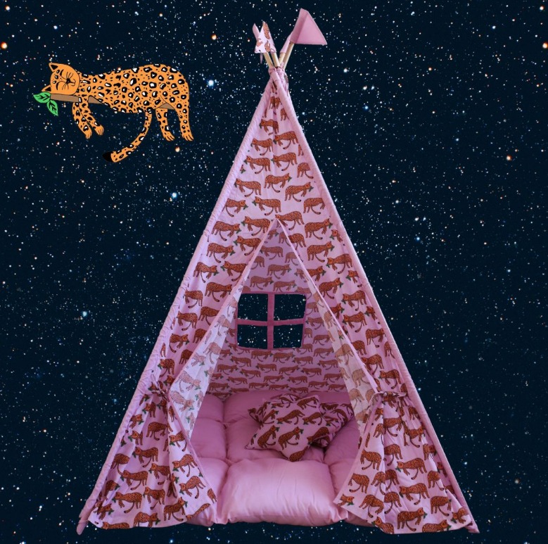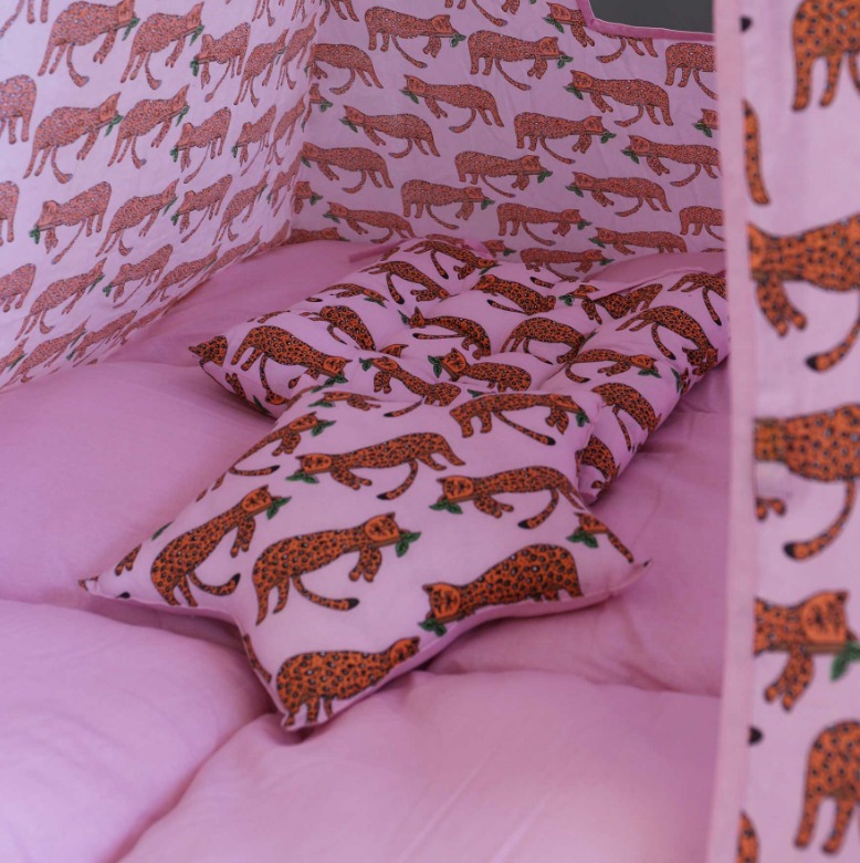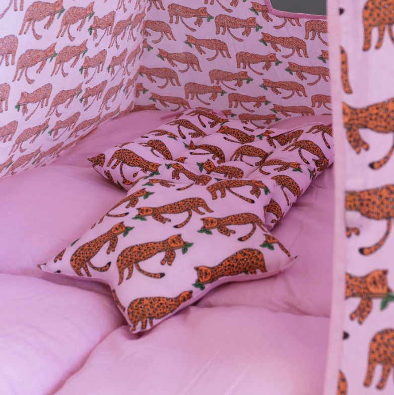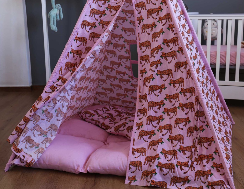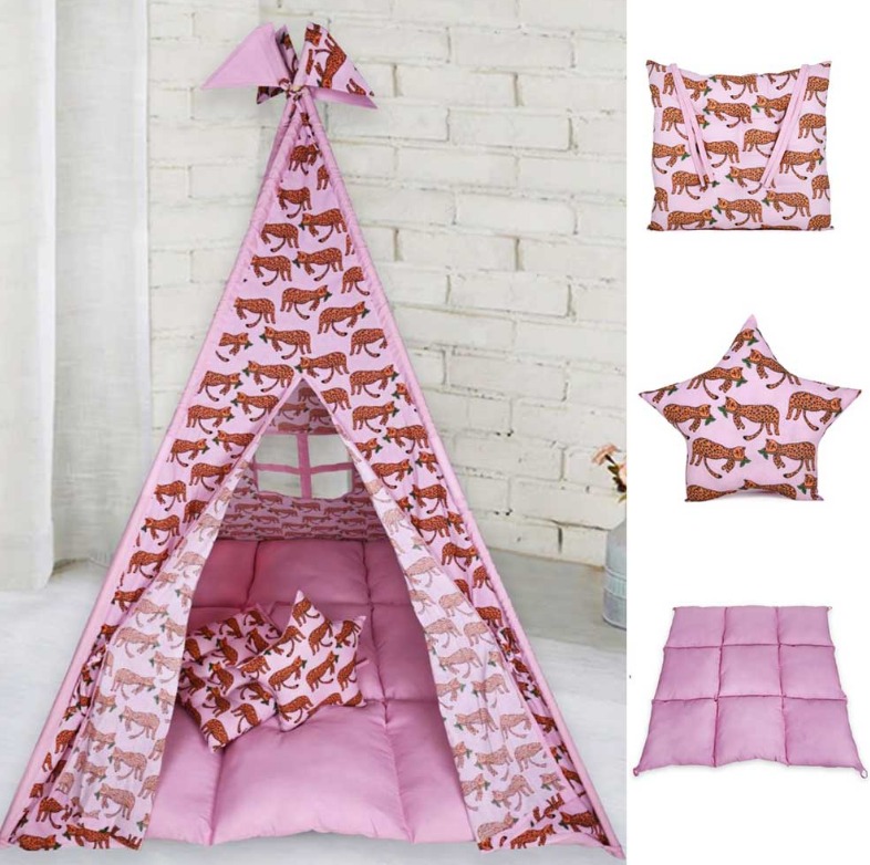 Изработени от естествени материали, със здрава дървена рамка, памучни тъкани и изключително дебела и пухкава основна възглавница създават най-топлото убежище за въображението на Вашето дете. Да не забравяме и другите две възглавници, едната в квадратна, а другата във формата на звезда, за почивка или пък.. за бой с възглавници!