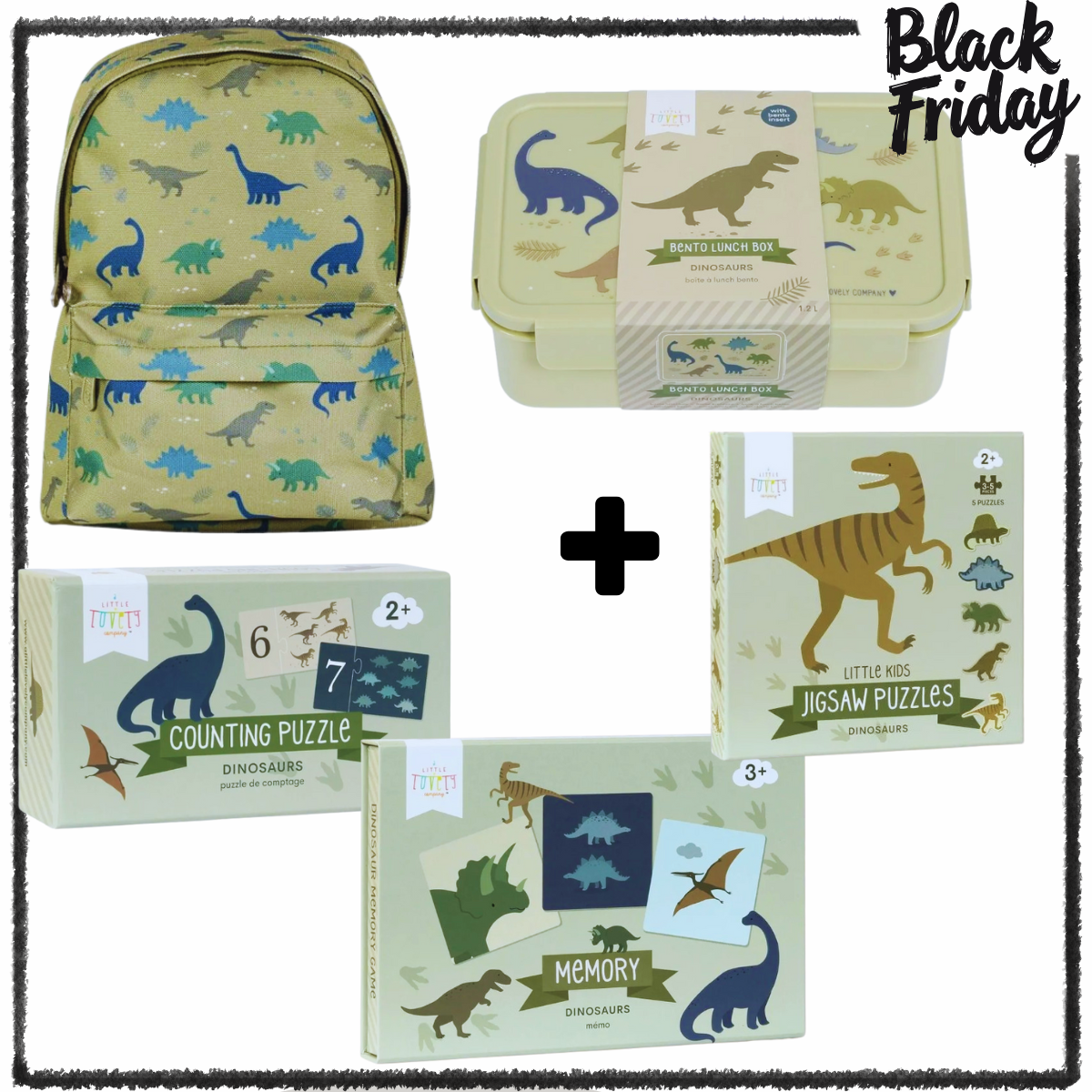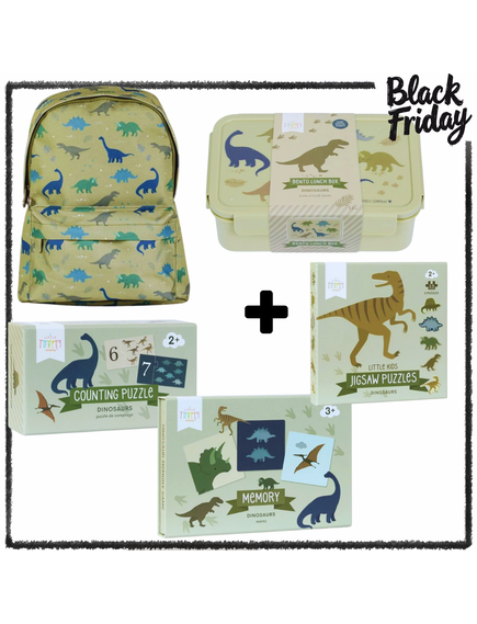 BF Combo: A little lovely company "Динозаври": Раница + Кутия за храна + Пъзел - игра за броене + Мемори настолна игра + Пъзел - мозайка