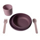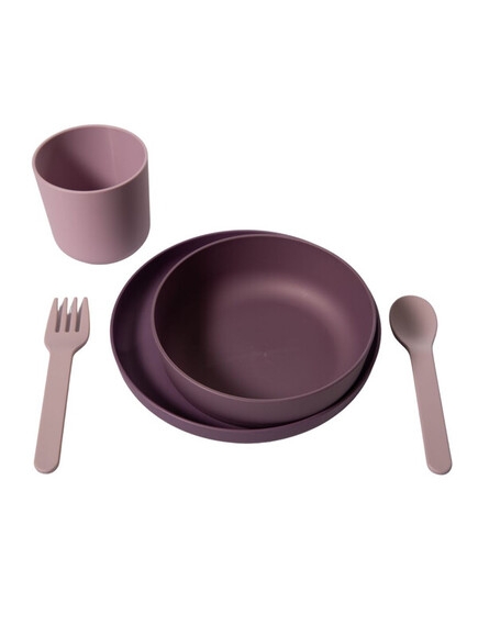 Сетът съдържа чаша, чиния, купичка и прибори за хранене.