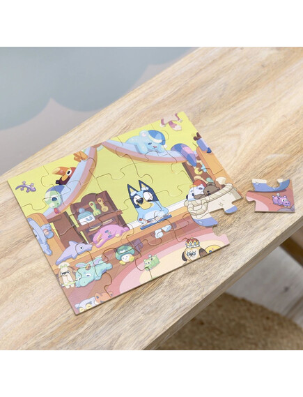 Пъзелът съдържа 20 дървени части със закачливи илюстрации от света на Bluey.