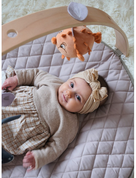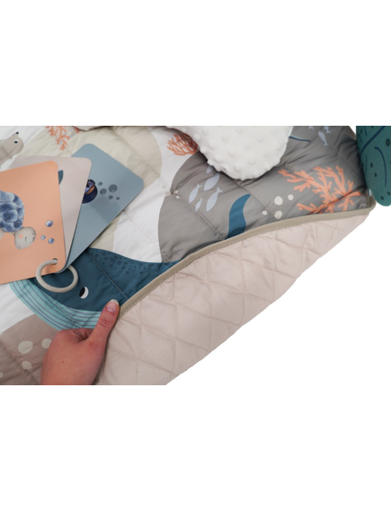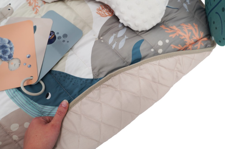 - Постелка: Мека и двустранна, със симпатични филцови фигурки отстрани, които стимулират сетивното развитие.