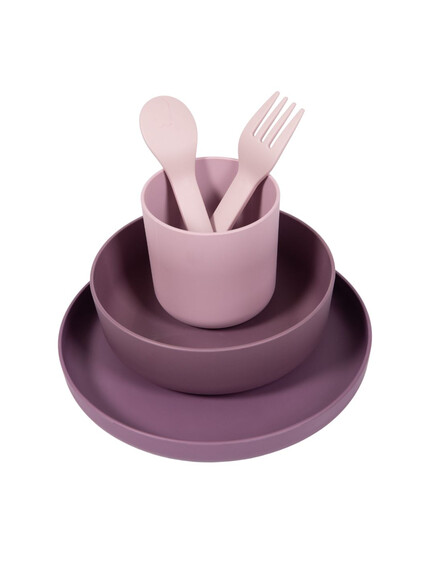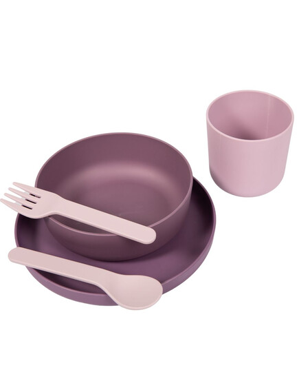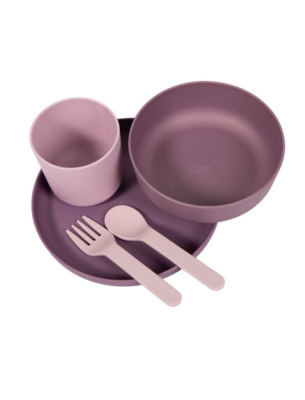 Сетът съдържа чаша, чиния, купичка и прибори за хранене.