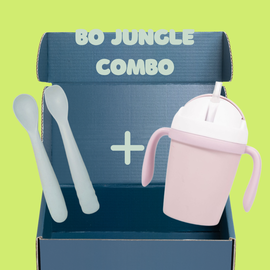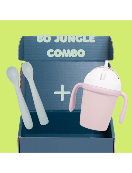 Bo Jungle Комбо: Сет силиконови лъжички "Сиво" + Eco-friendly чаша с дръжки и сламка - цвят по избор