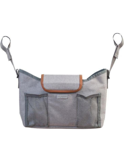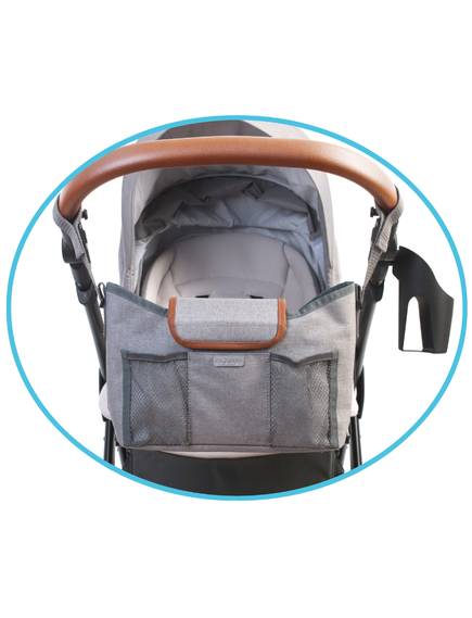 Има вътрешни джобове и 2 външни с мрежа. Отстрани има две каишки с велкро лепенки, за да можете да го закачите за количката на бебето си.