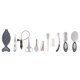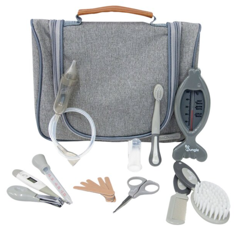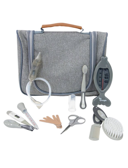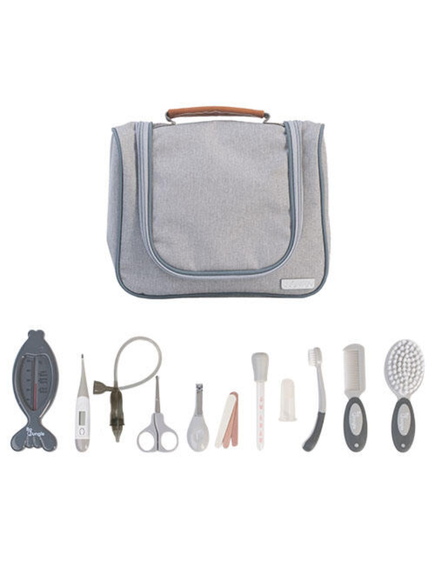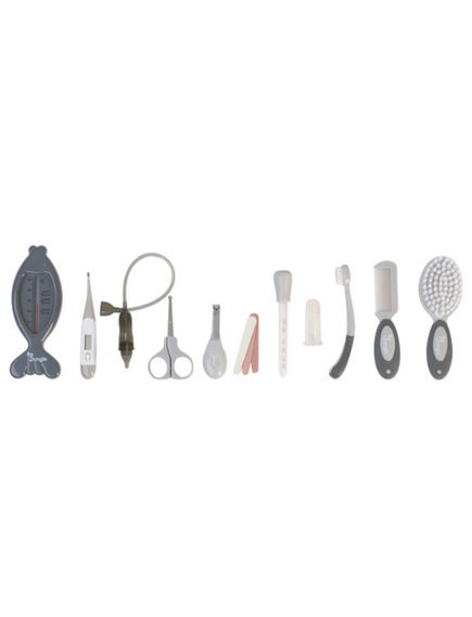 Сетът включва: пила за нокти, ножици, четка за зъбки, четка за зъбки за пръста, гребен, мека четка, мек дигитален термометър, термометър за баня, помпичка за нос и нокторезачки, тапа за нос и капкомер за бебе .