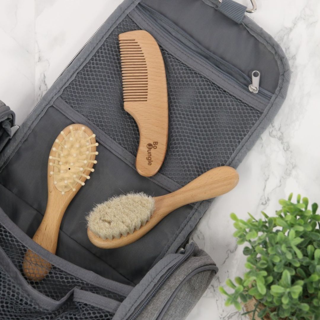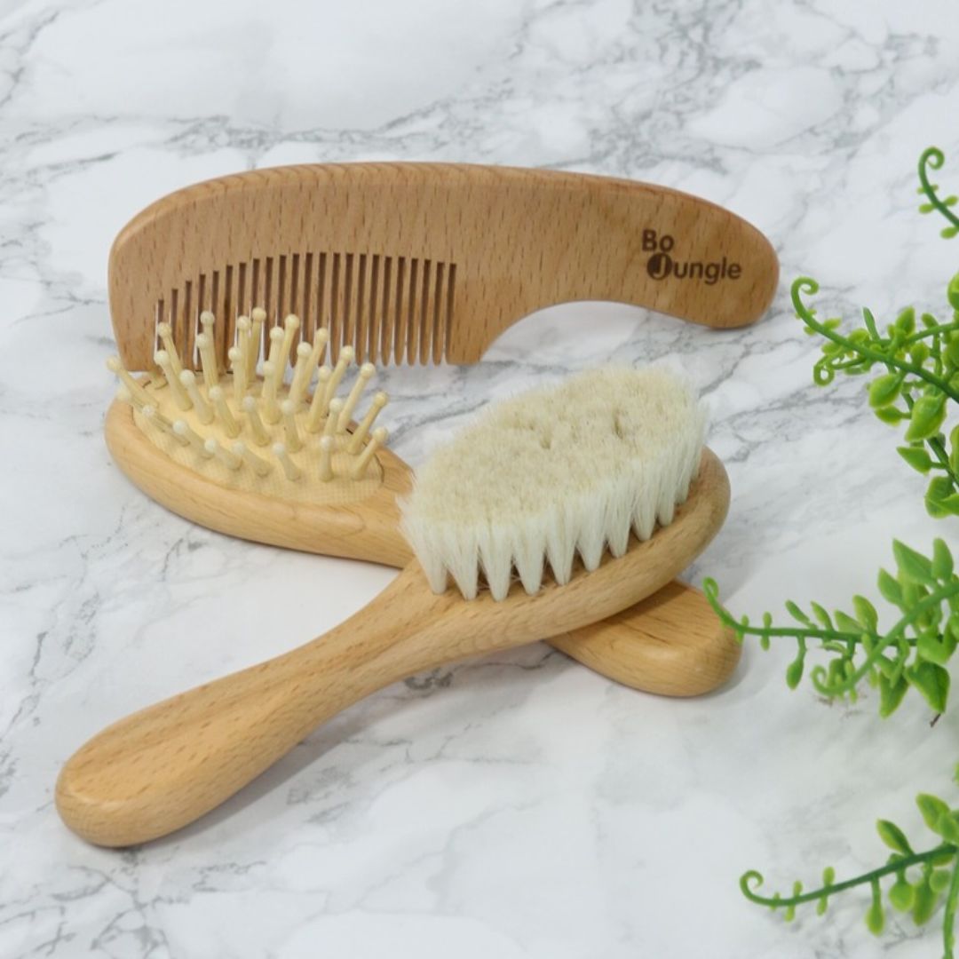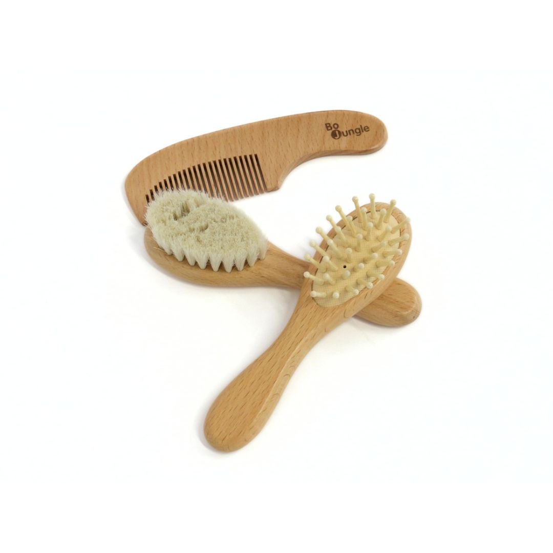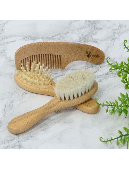 Bo Jungle създаде комплект четки и гребенче за грижа за нежната главичка на Вашето бебе. Комплектът е изработен от дърво, а четката е с естествен косъм.