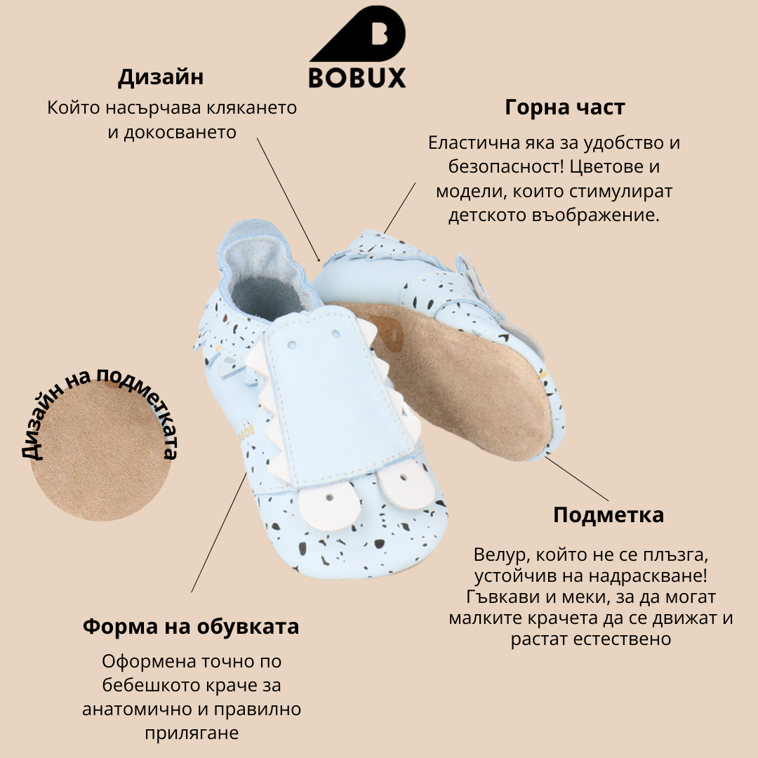 Bobux проектира обувки, които подпомагат здравословното развитие и свободата на движение на бебетата още от първите им стъпки. Bobux Soft Sole са перфектният избор за първото пълзене и стъпване на малкото ви съкровище, осигурявайки комфорт, защита и свобода на всяко движение.