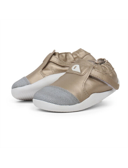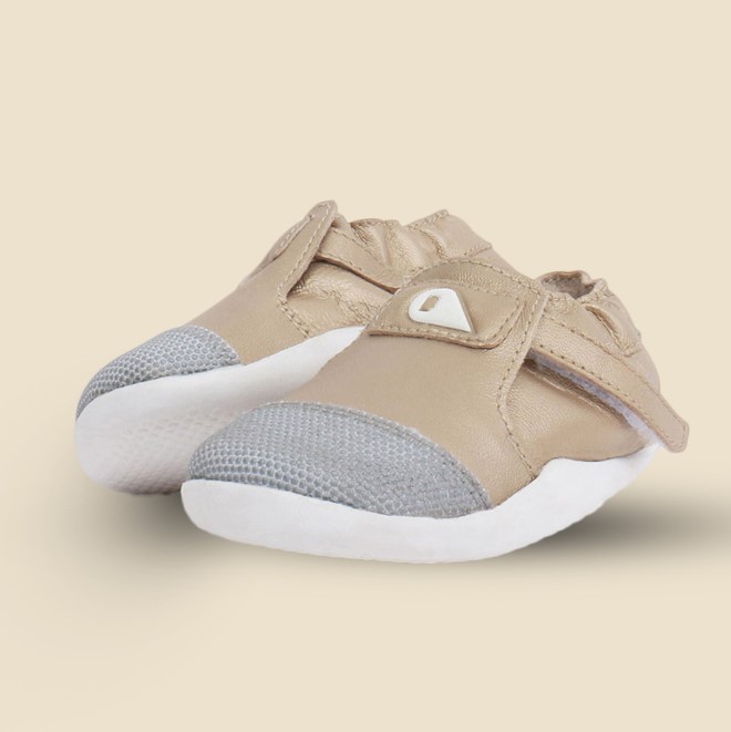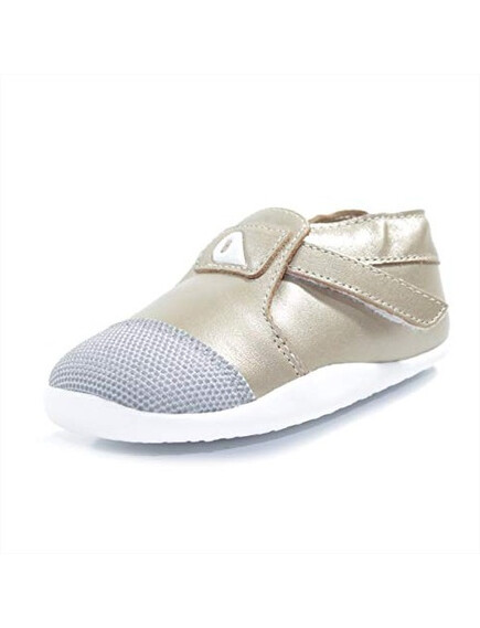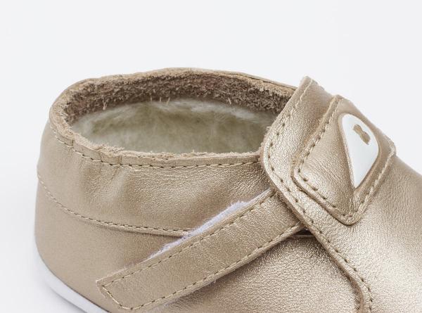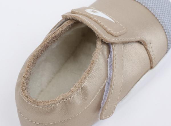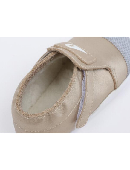 Външната част е изработена от кожа, осигуряваща защита за малките крачета, особено когато се изправят пред голямото предизвикателство – първите стъпки. Благодарение на еластичното велкро закопчаване, обувките се обуват лесно и стоят стабилно около глезена. Подметките от EVA материал са гъвкави и издръжливи, което ги прави идеални за прохождането на малките изследователи.