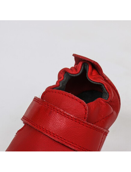 Външната част е изработена от кожа, осигуряваща защита за малките крачета, особено когато се изправят пред голямото предизвикателство – първите стъпки. Благодарение на еластичното велкро закопчаване, обувките се обуват лесно и стоят стабилно около глезена. Подметките от EVA материал са гъвкави и издръжливи, което ги прави идеални за прохождането на малките изследователи.