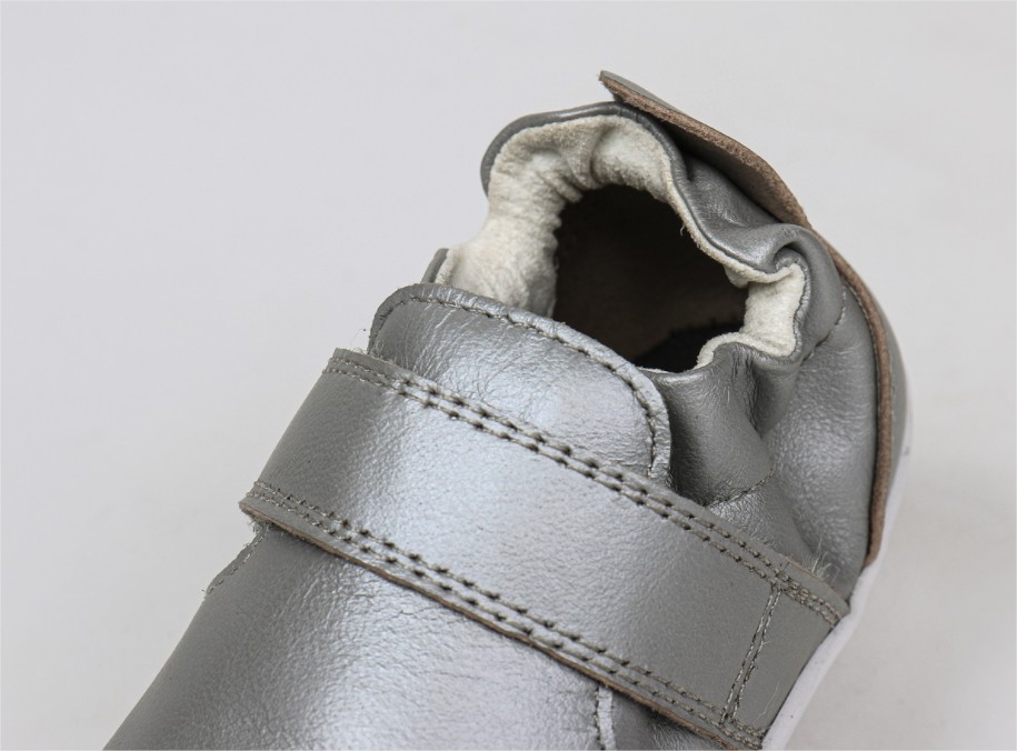 Външната част е изработена от кожа, осигуряваща защита за малките крачета, особено когато се изправят пред голямото предизвикателство – първите стъпки. Благодарение на еластичното велкро закопчаване, обувките се обуват лесно и стоят стабилно около глезена. Подметките от EVA материал са гъвкави и издръжливи, което ги прави идеални за прохождането на малките изследователи.
