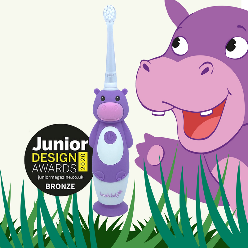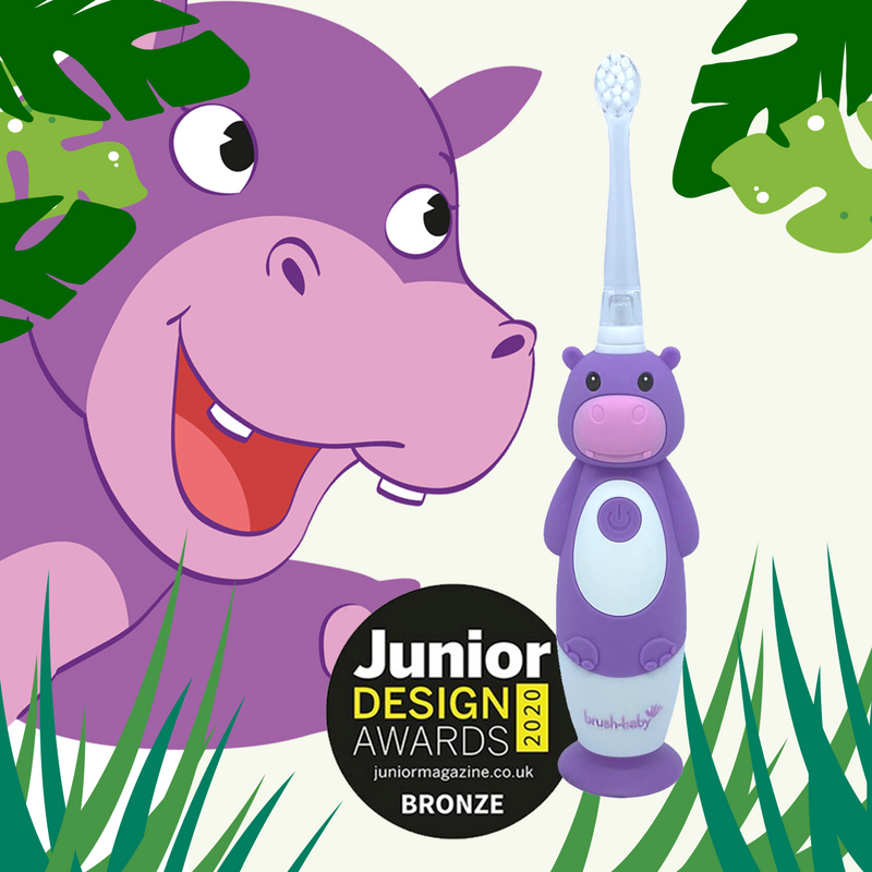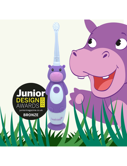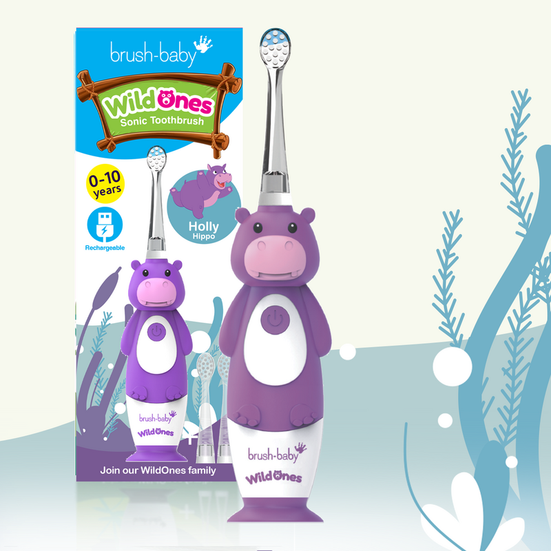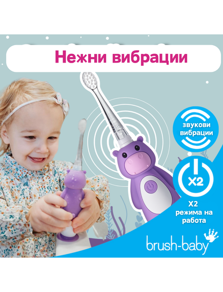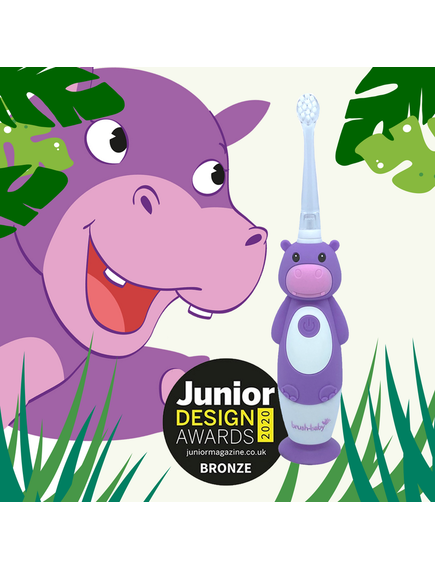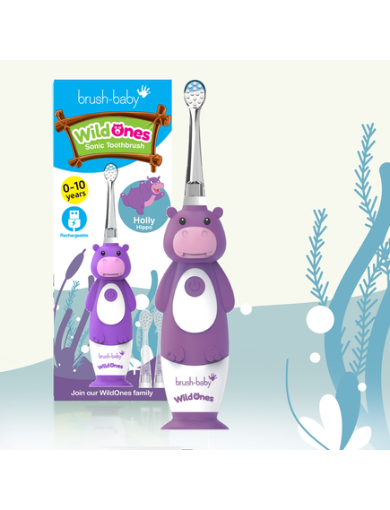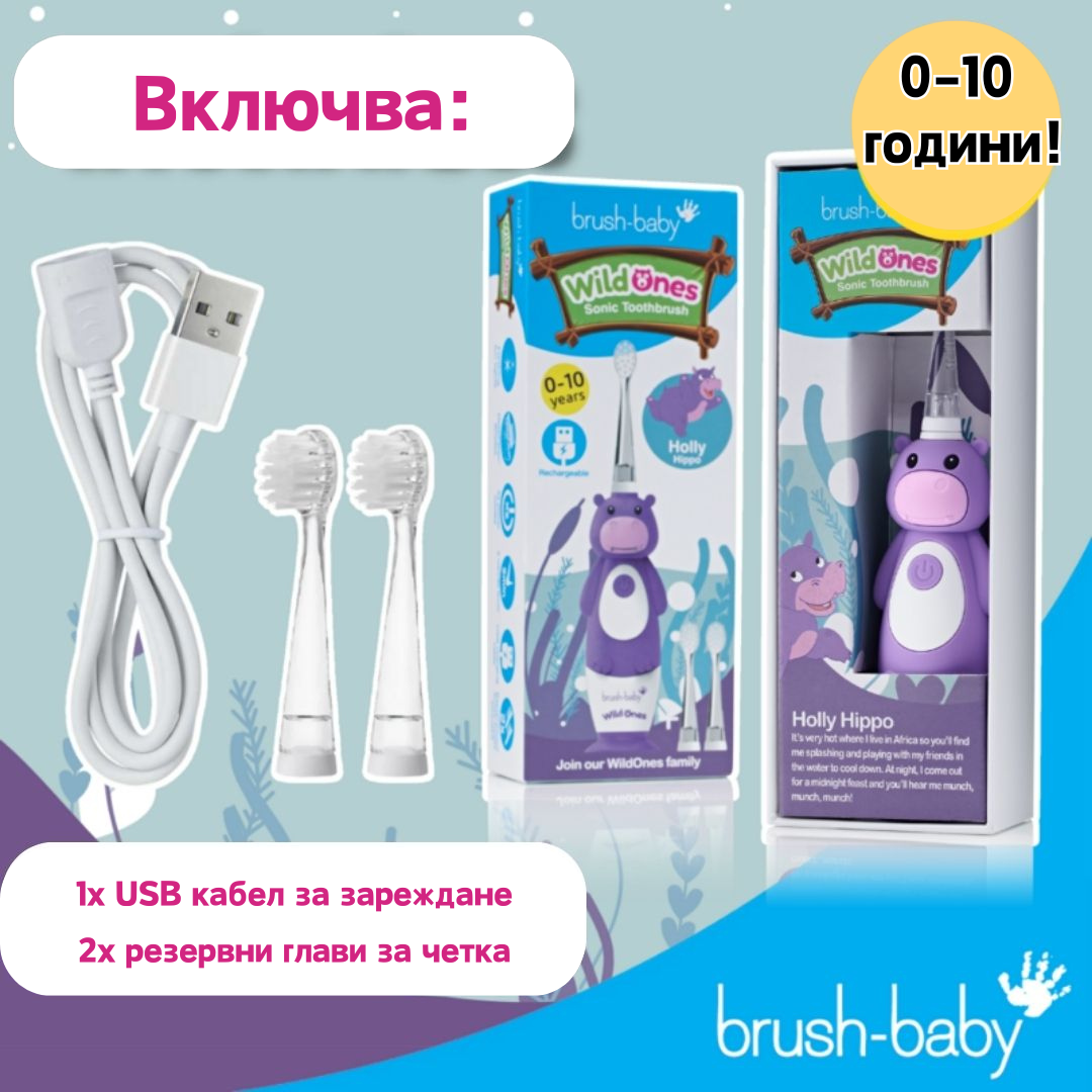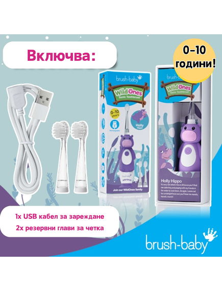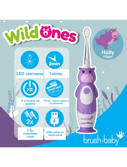 Brush-Baby: Електрическа четка за зъби с USB захранване и 2 бр. резервни глави Hippo WildOnes от 0 до 10+ години