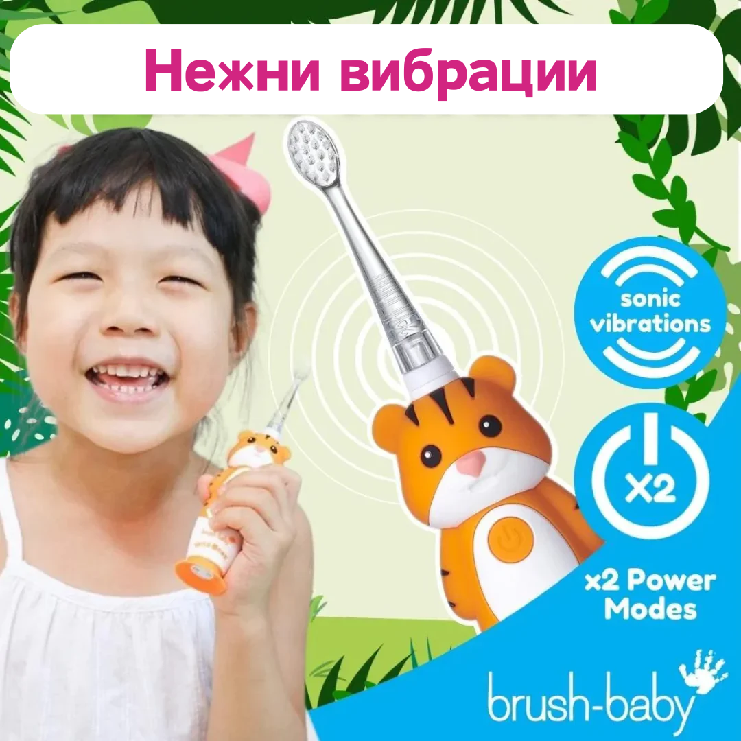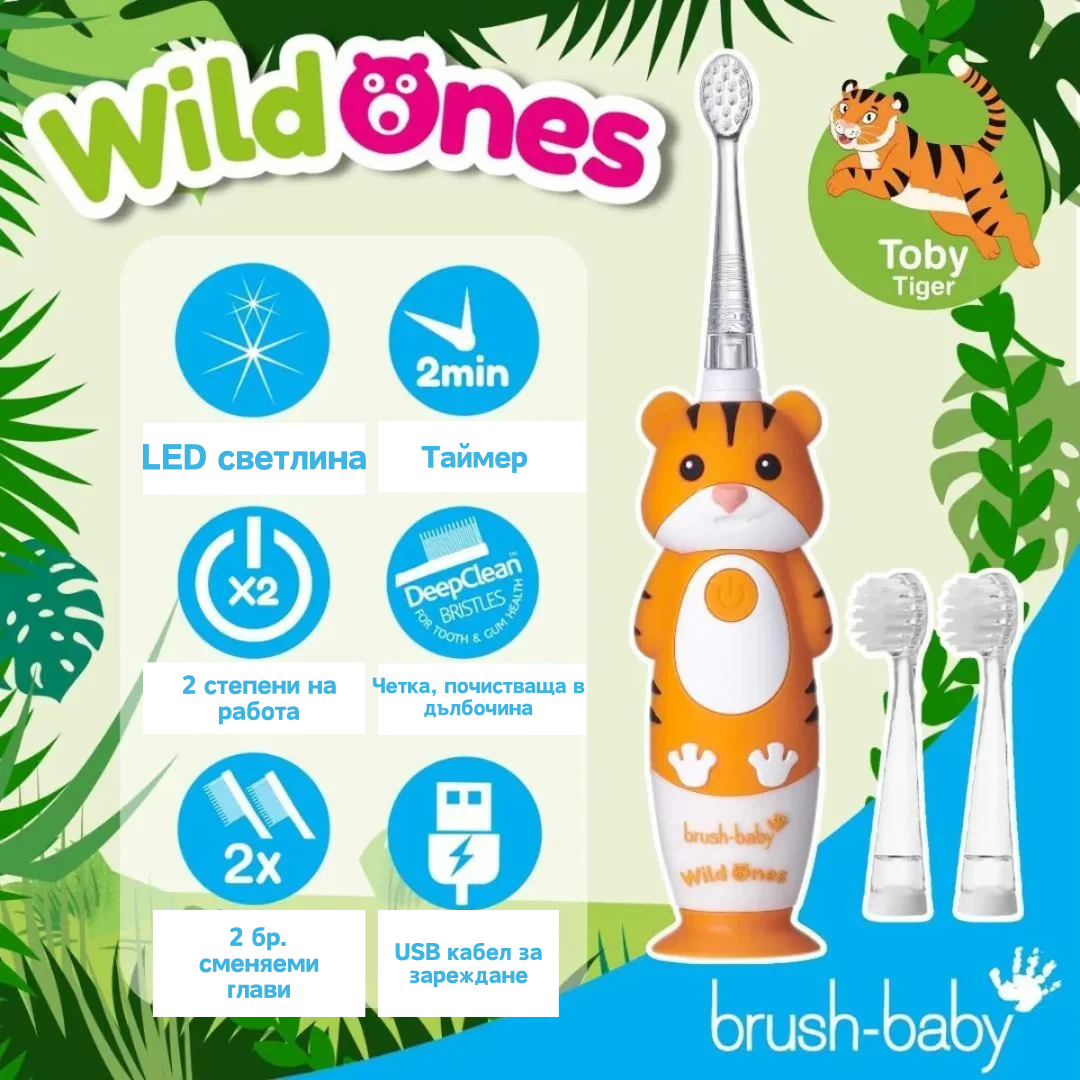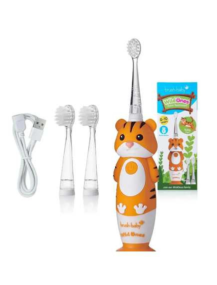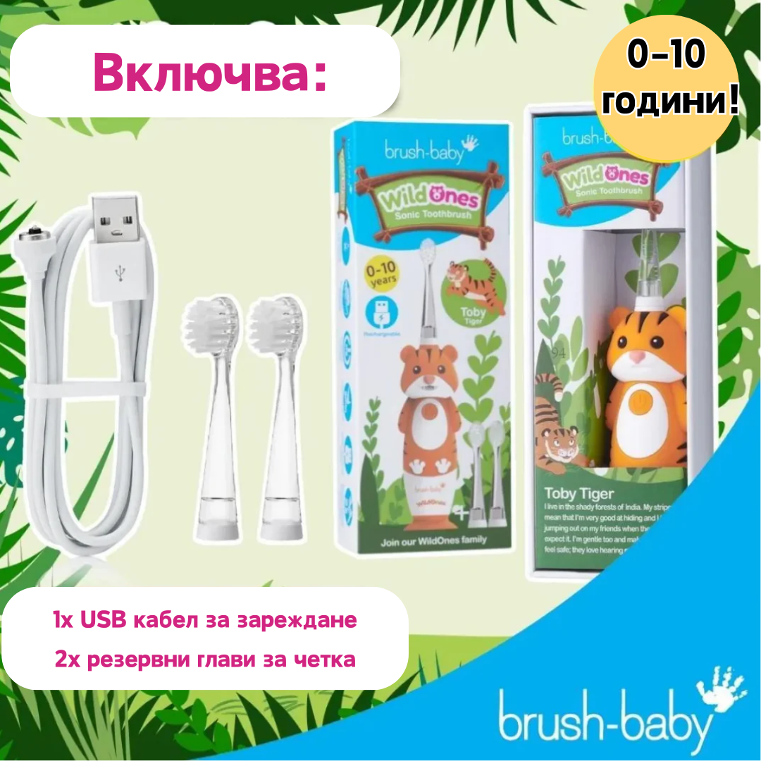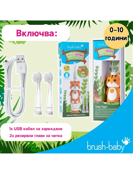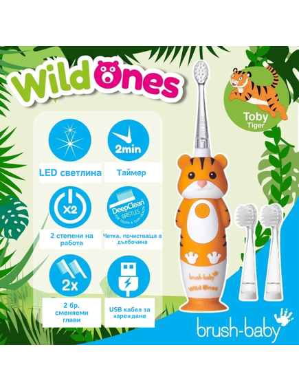 Brush-Baby: Електрическа четка за зъби с USB захранване и 2 бр. резервни глави Tiger WildOnes от 0 до 10+ години