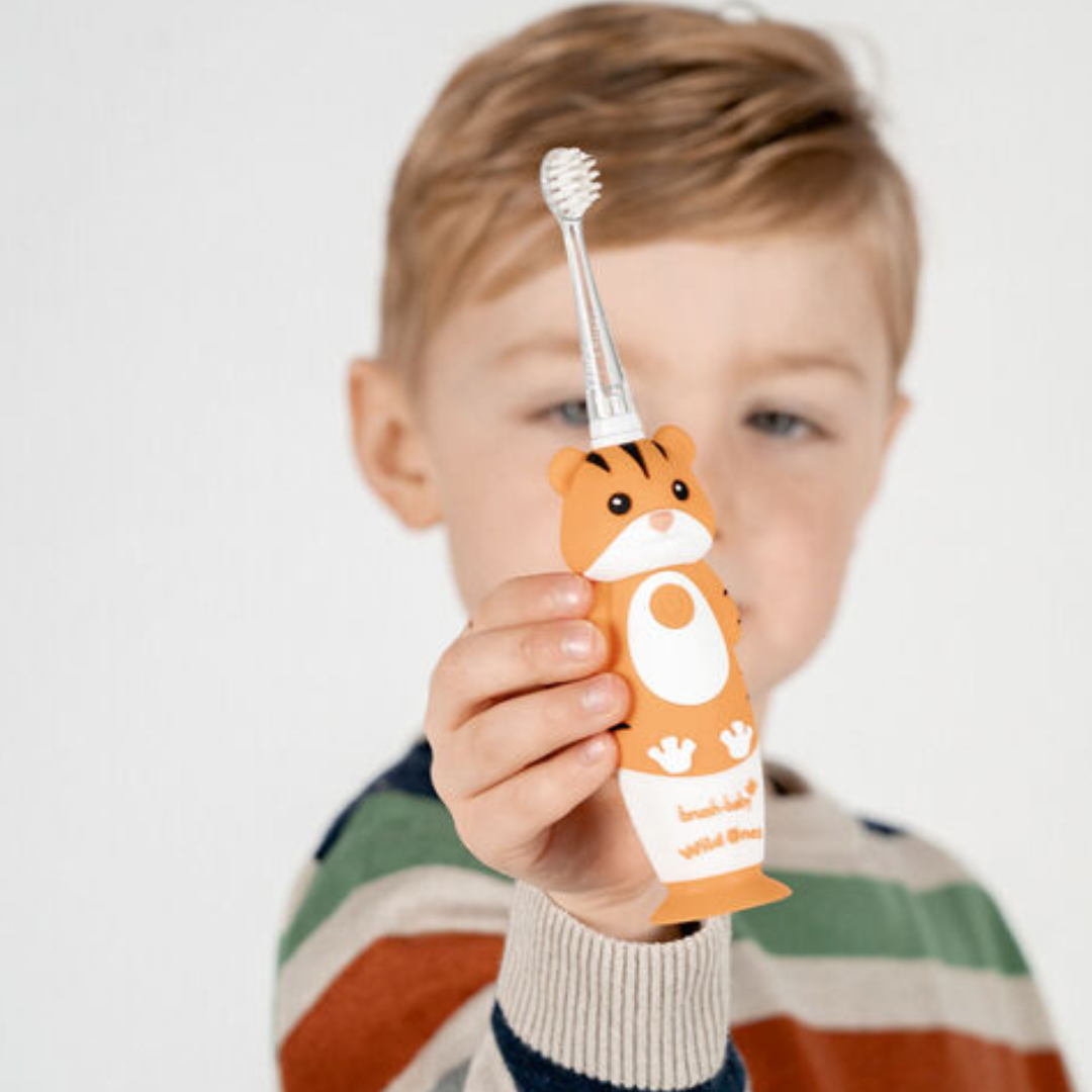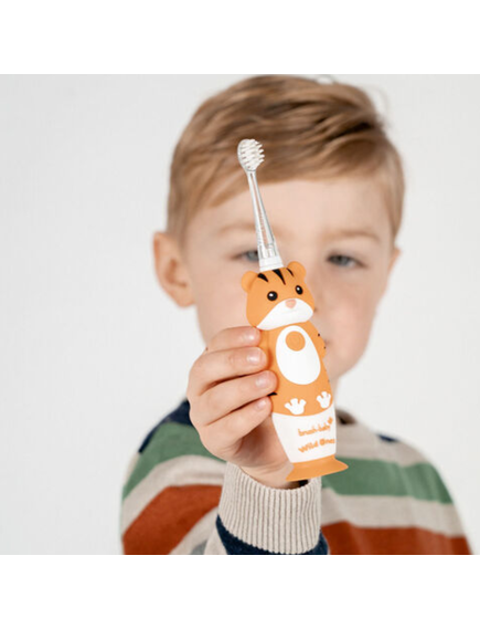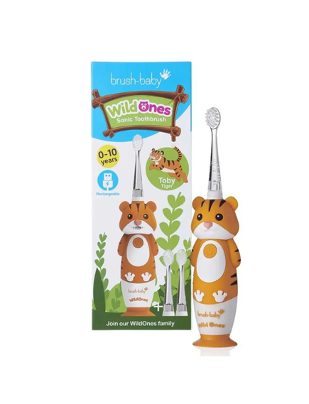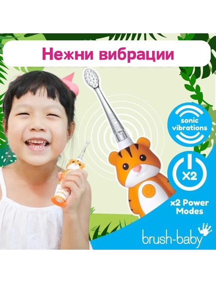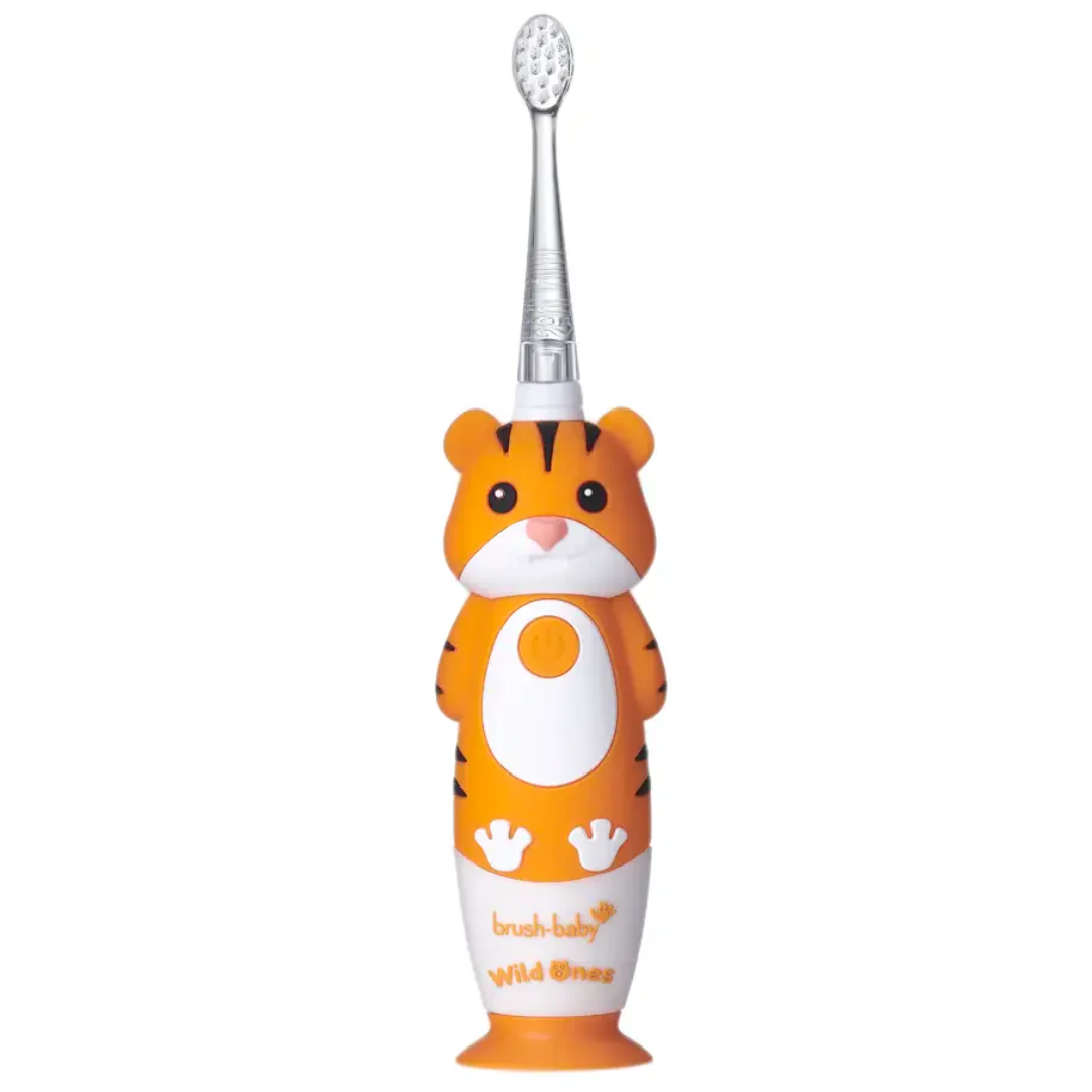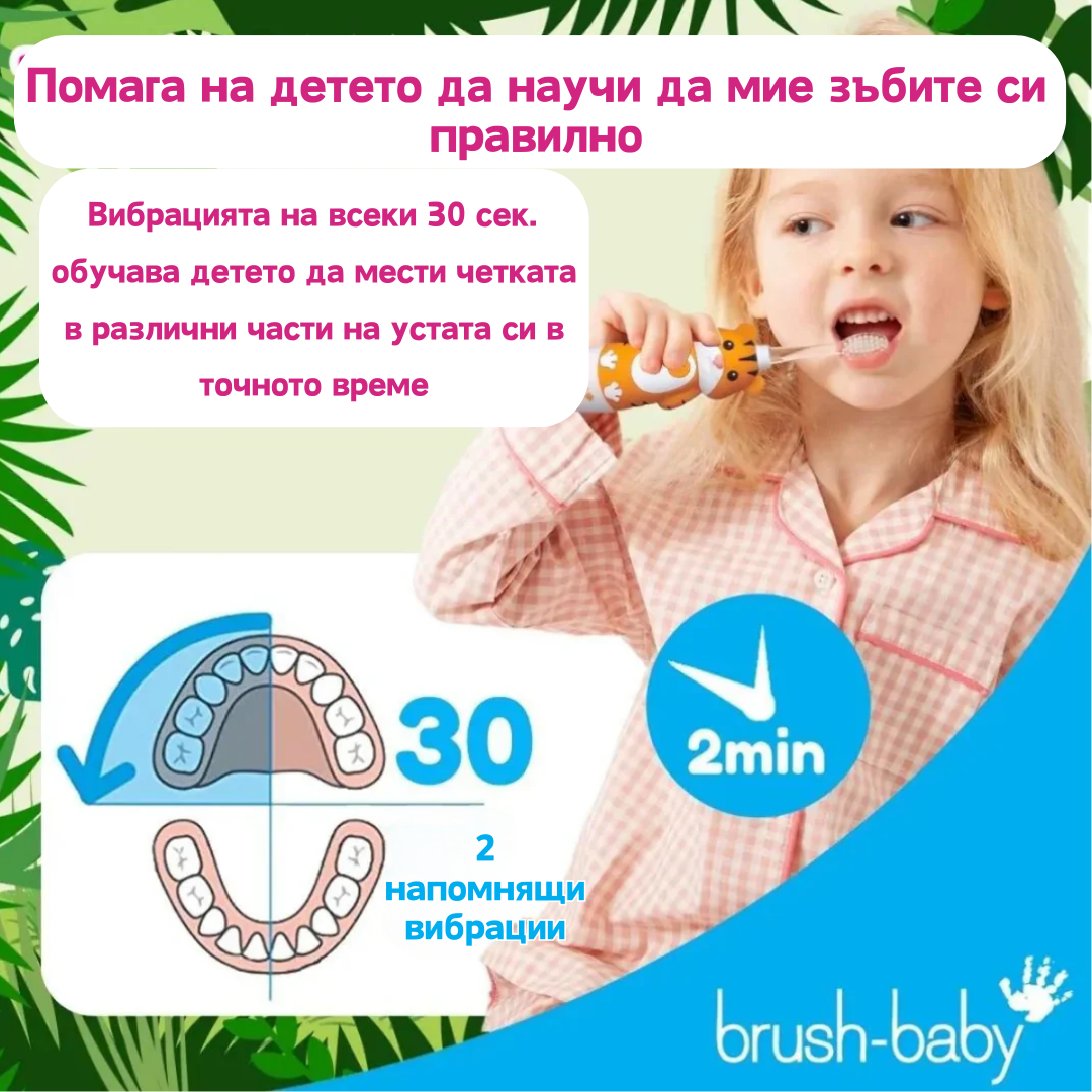 Brush-Baby: Електрическа четка за зъби с USB захранване и 2 бр. резервни глави Tiger WildOnes от 0 до 10+ години