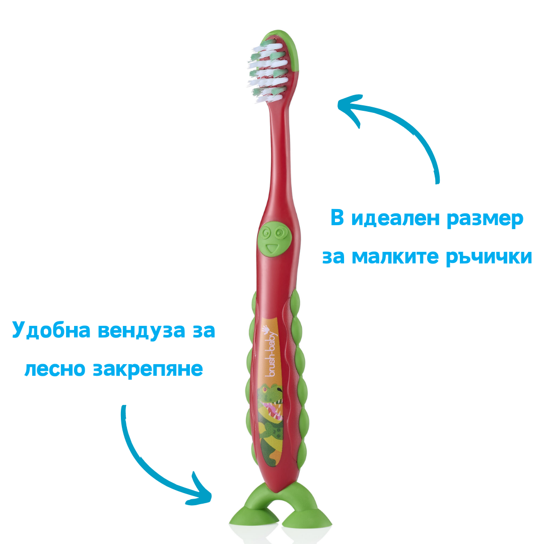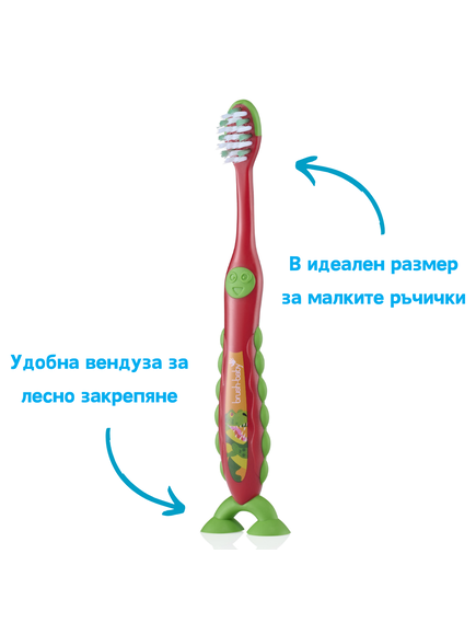 Помогнете на детето си да развие добри навици за орална хигиена с четката за зъби Brush-Baby FlossBrush, специално проектирана за възраст 3-6 години. Малката глава и ергономичната дръжка улесняват хващането от малките ръчички, докато забавните крачета с вендузи позволяват да се съхранява навсякъде в банята, което прави миенето на зъбите по-забавно.