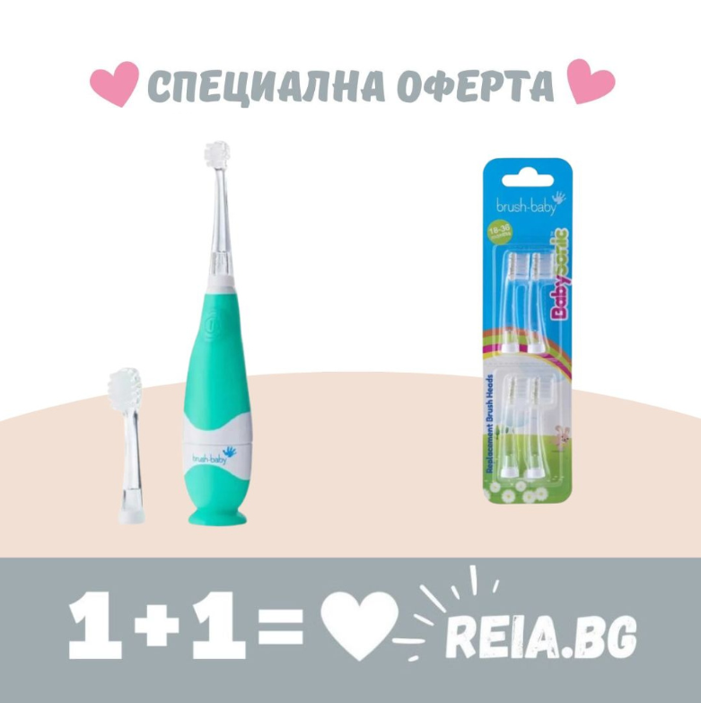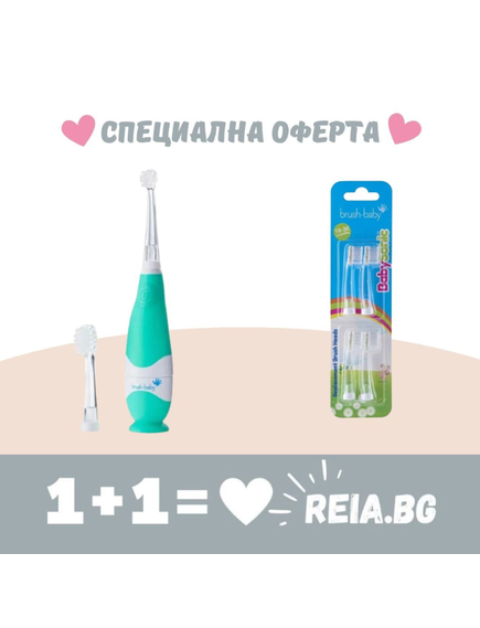 Brush-Baby: Комбинирай и Спести - Електрическа четка за зъби с USB зареждане и 1бр. резервна глава BabySonic Teal 0-3 години + Резервни глави за електрическата четка за зъби BabySonic 18-36 месеца (комплект от 4 бр.)