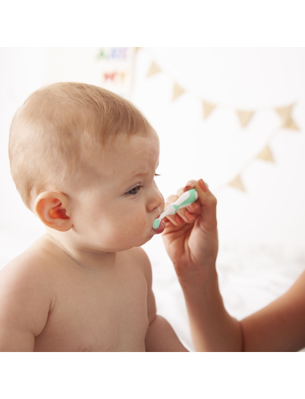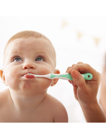 Грижата за устната хигиена започва още от първия ден! Дори ако бебето има само няколко зъбчета или е в процес на никнене, използването на специализирана четка като First Brush™ е от съществено значение.
