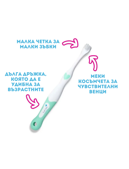 Насърчава добрите хигиенни навици – Лесната за хващане дръжка подпомага малките ръчички да започнат да експериментират с държането и миенето на зъби. Малката глава на четката е специално проектирана за бебешката уста, като насърчава създаването на здравословни навици от ранна възраст.