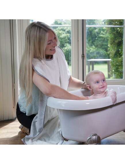 - Удобство при употреба: Слага се като престилка, което ви позволява да гушнете бебето веднага след банята, без да се намокрите.