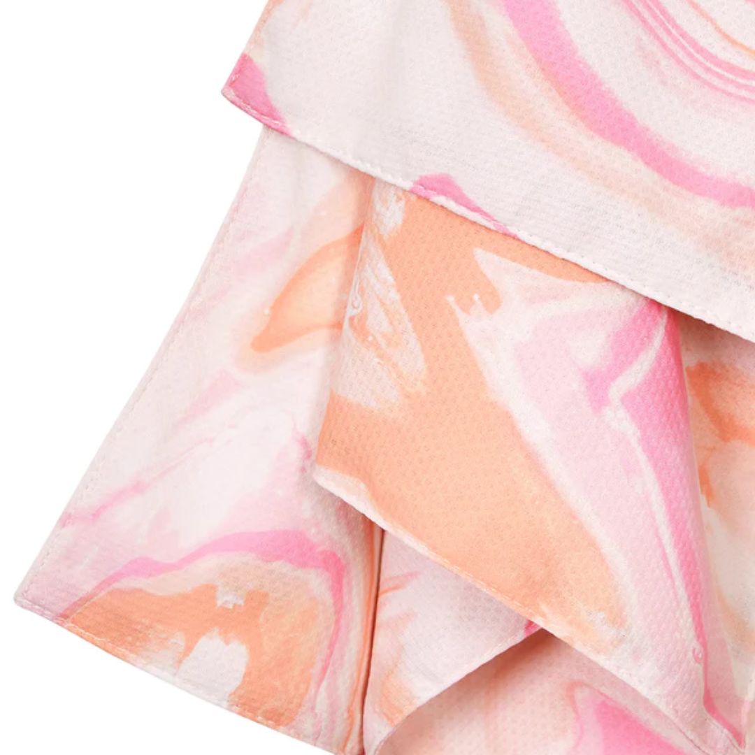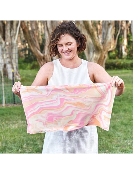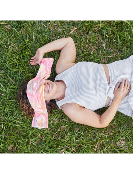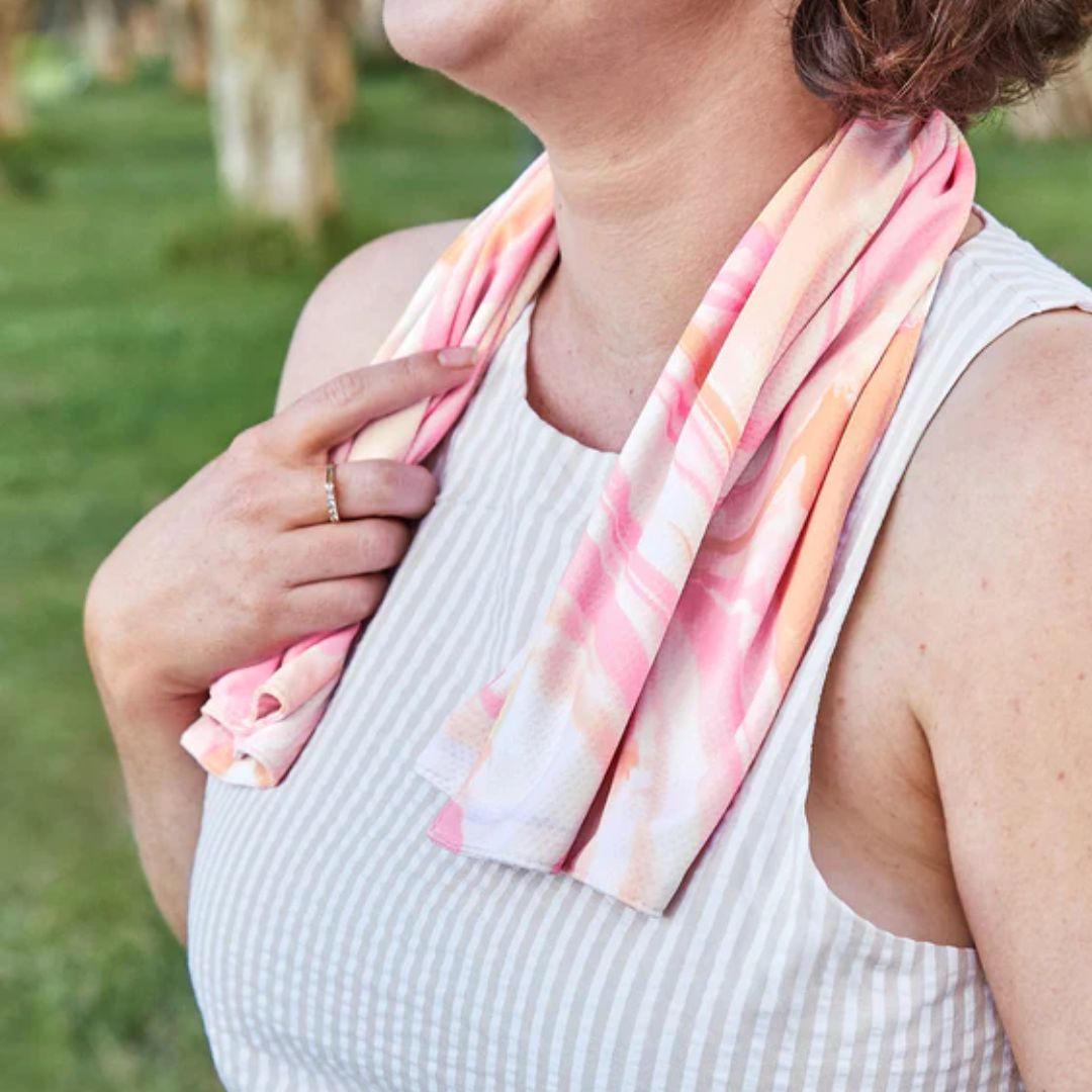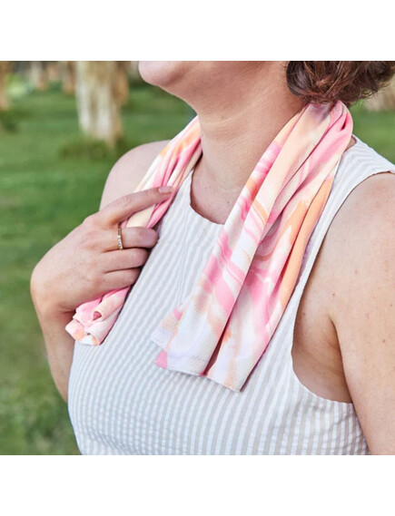 Останете свежи дори в най-горещите дни! Благодарение на вградените микрочастици от нефрит, кърпата се охлажда веднага щом се намокри – без никакви химикали.