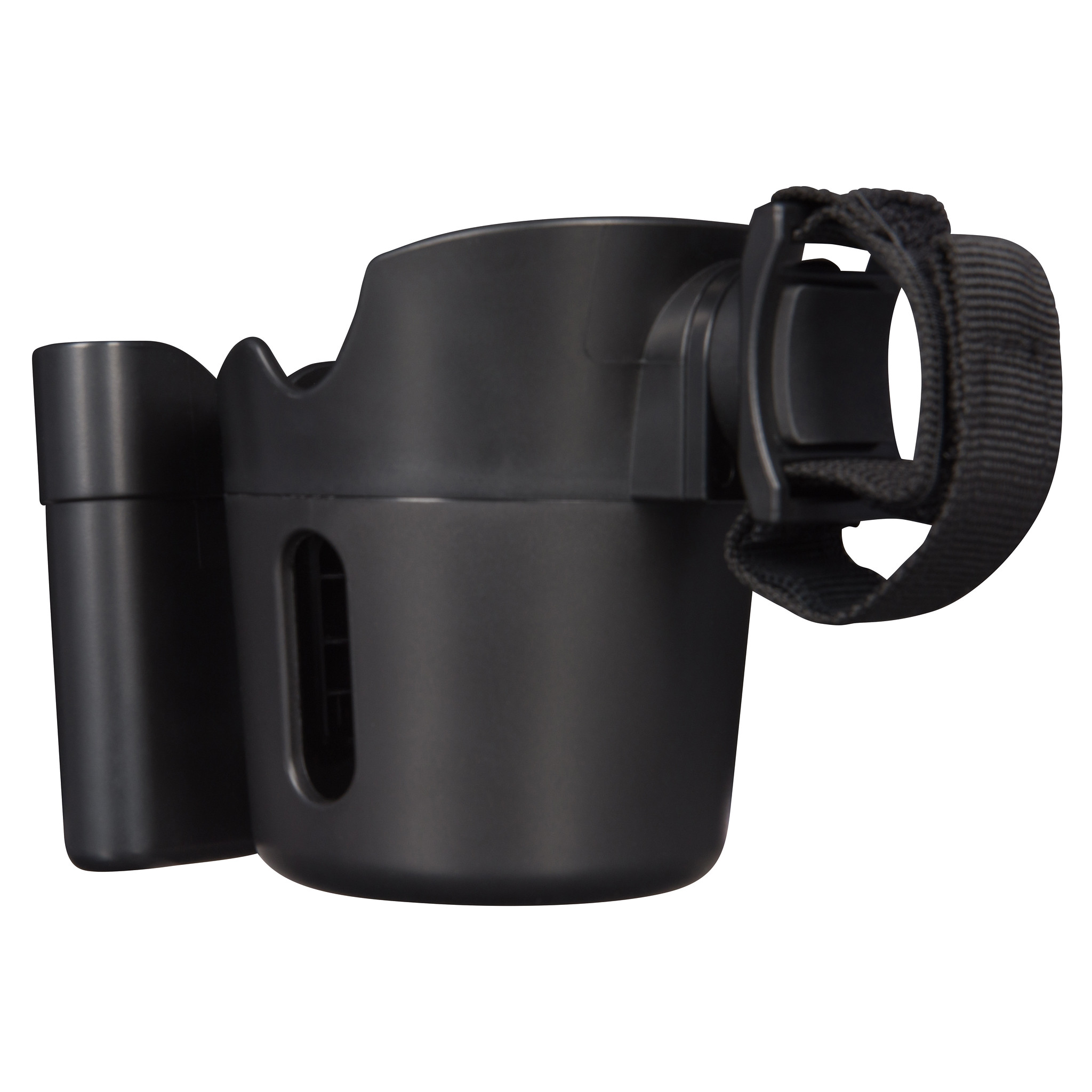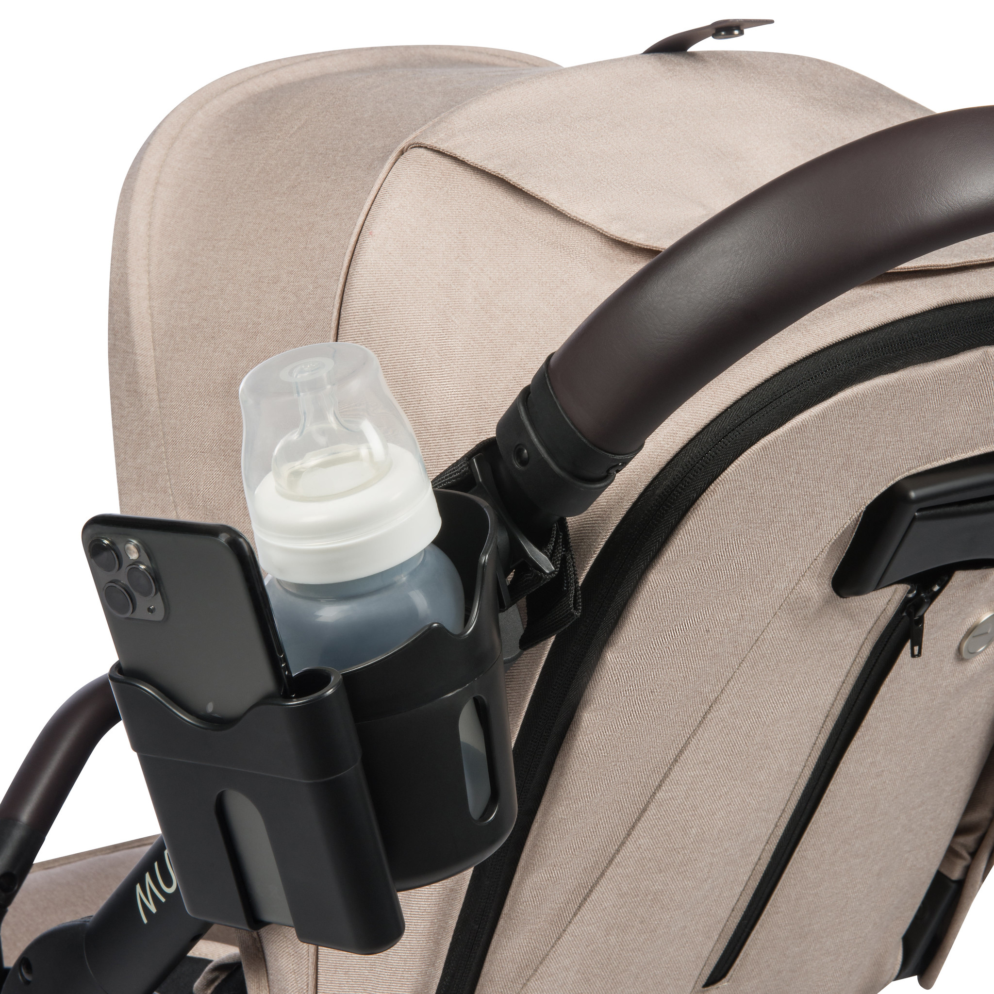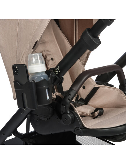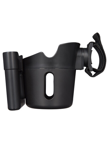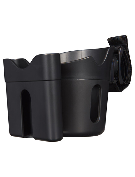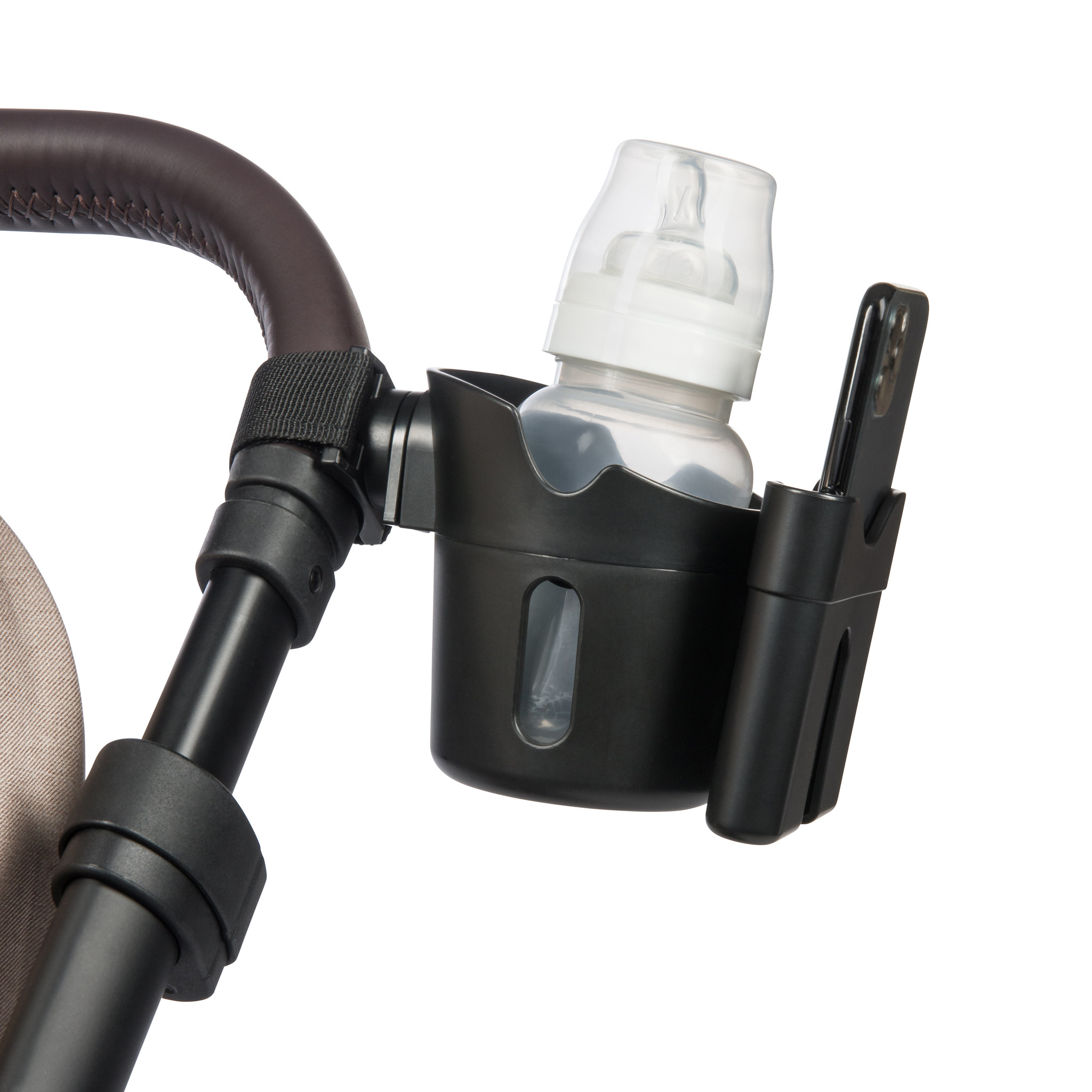 Практичен аксесоар за вашата количка, който съчетава поставката за вашия мобилен телефон с поставка за чаша или бебешката бутилка!