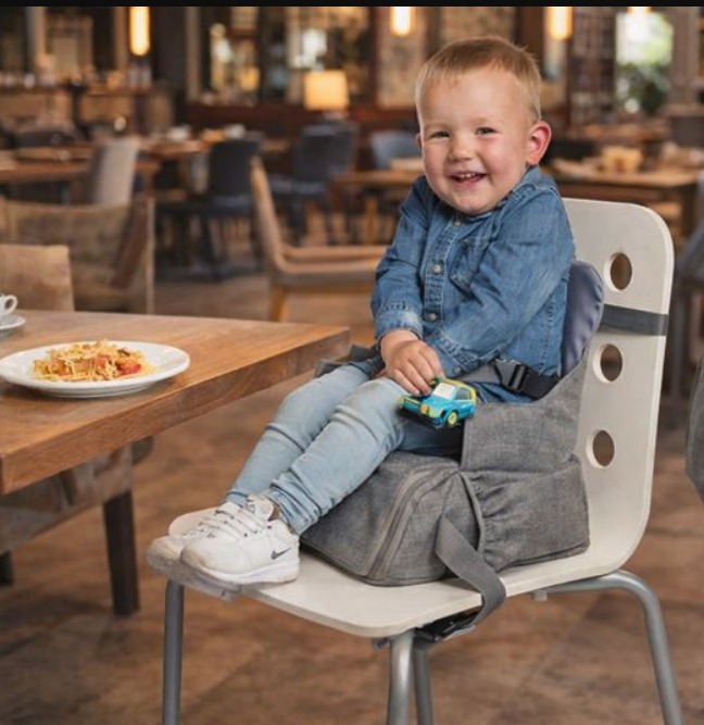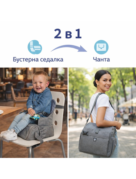 С бустерната преносима седалка 2в1, Вашето дете може безпроблемно да седи удобно и безопасно на масата, а освен това тя може да се използва и като удобна и компактна чанта за Вашите разходки.