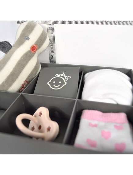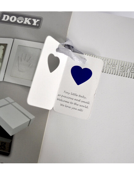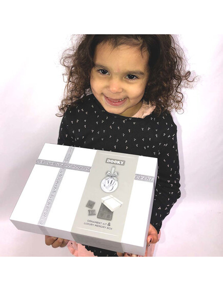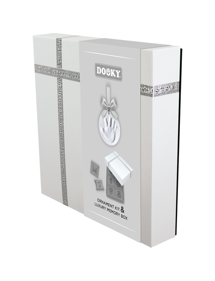 С комплекта Dooky Original Ornament можете лесно да направите глинен отпечатък от ръчичка или краче на вашето мъниче, който ще остане за цял живот. Луксозната кутия за спомени със сребърна релефна панделка предлага място за бебешки сувенири като залъгалка, кичур за коса, зъб, гащеризон и др. Включва разделители, кутийка за зъби и друга за кичур за коса.