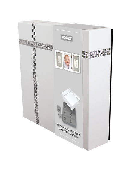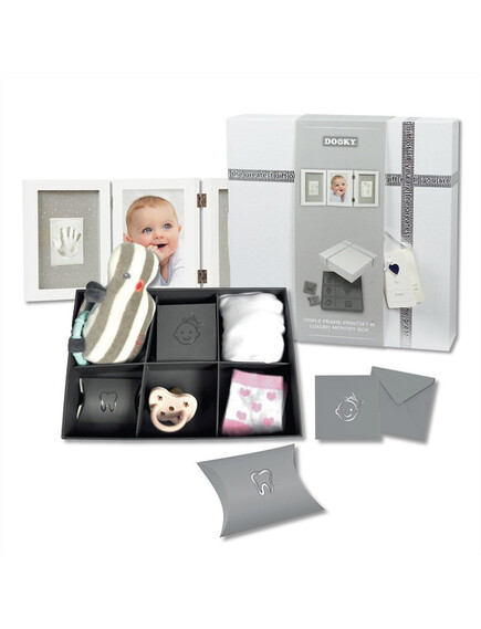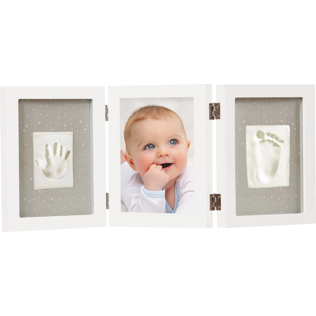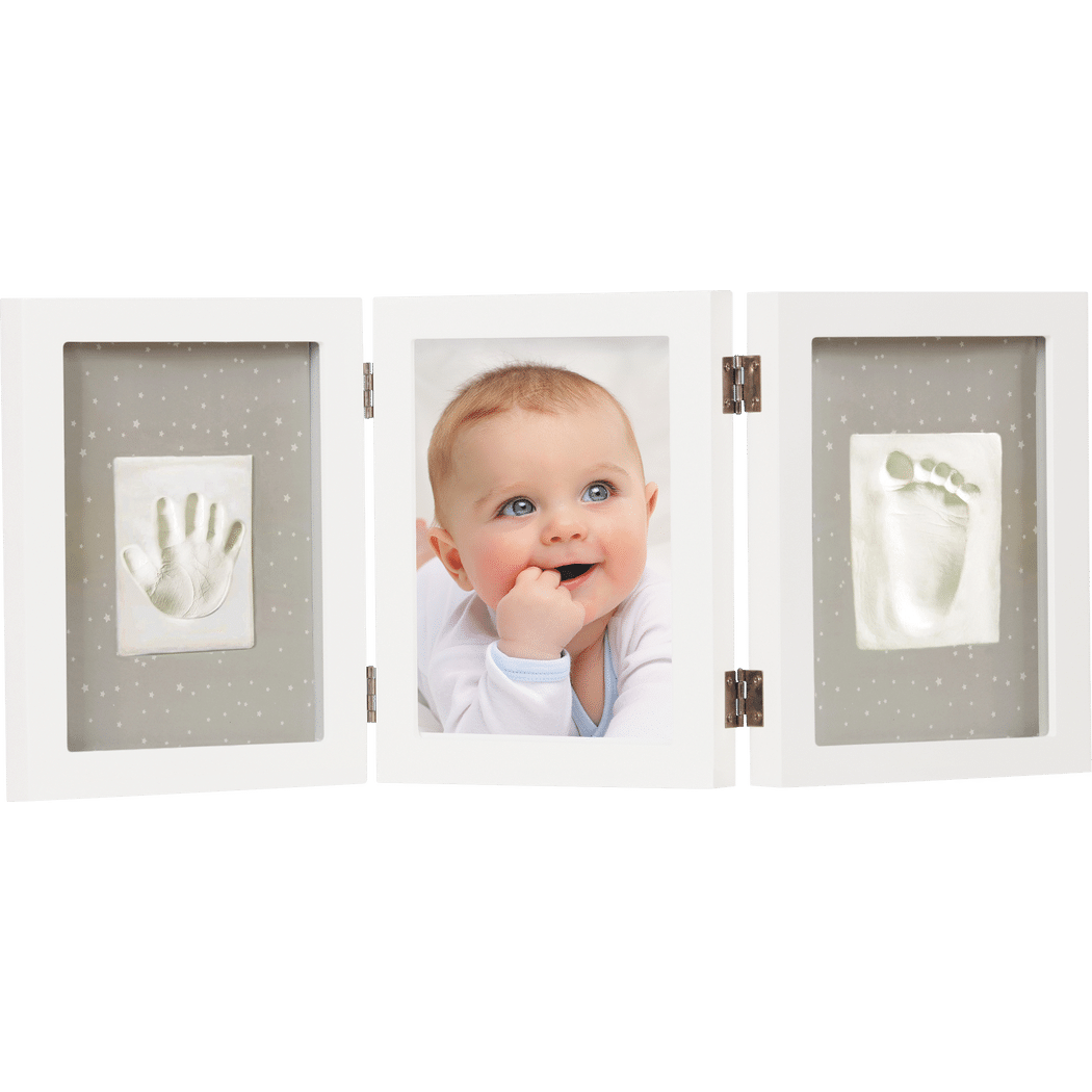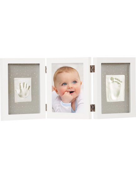 Съвременната бяла рамка предлага място за снимка плюс отпечатък от ръка и краче на вашето мъниче. Отпечатъците могат лесно да бъдат направени с глината, включена в опаковката, следвайки ръководството.