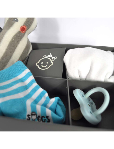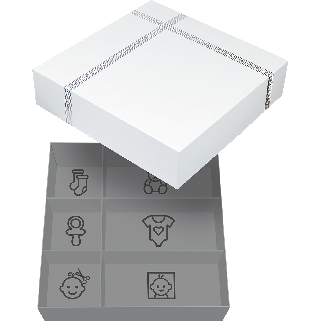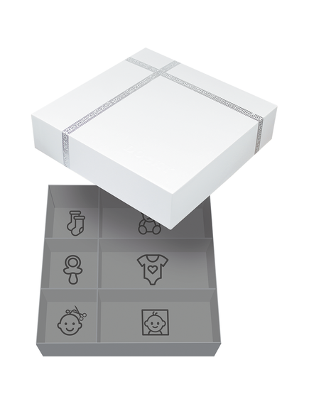 Луксозната кутия за спомени със сребърна релефна панделка предлага място за бебешки сувенири като залъгалка, кичур за коса, зъб, гащеризон и др. Включва разделители, кутийка за зъби и друга за кичур за коса.