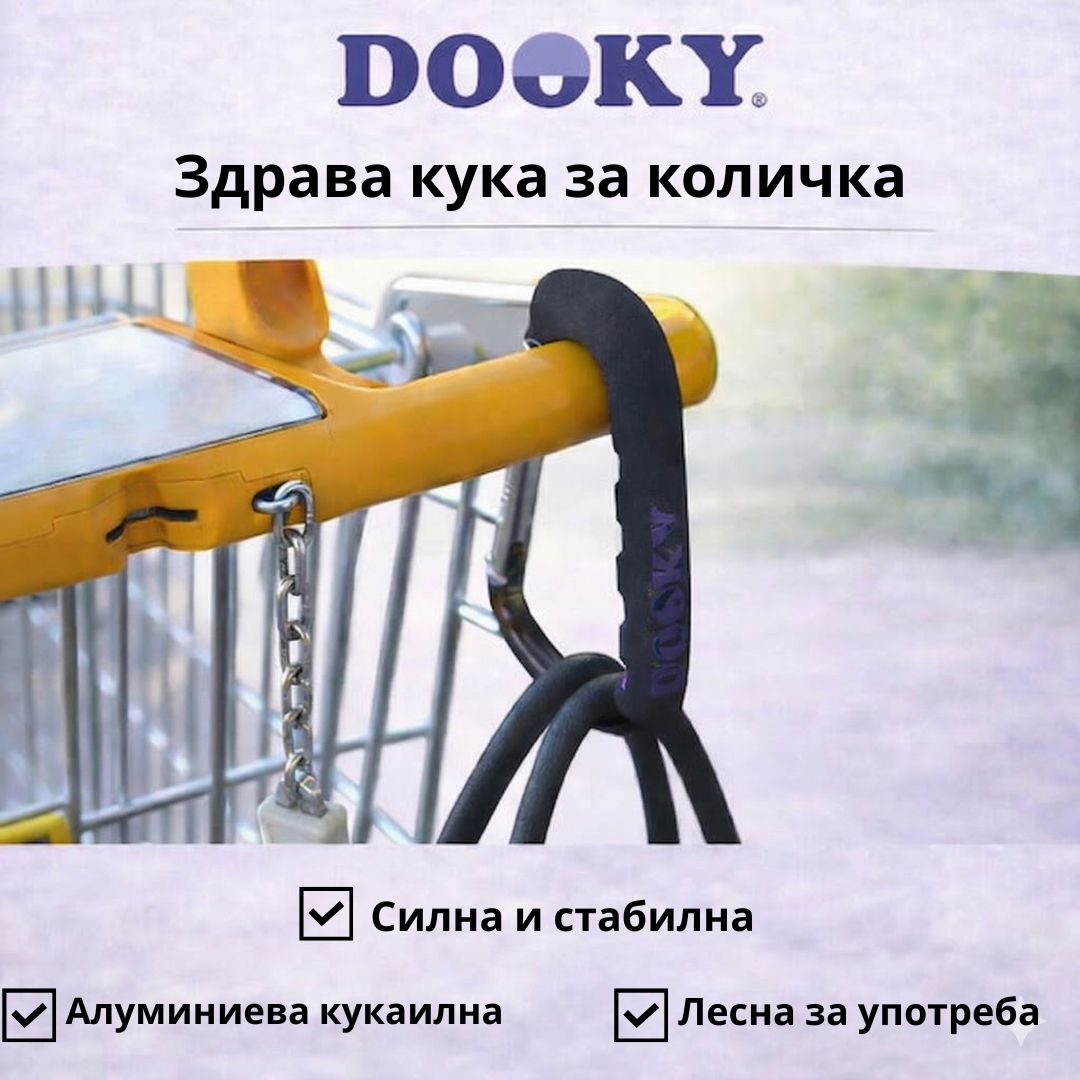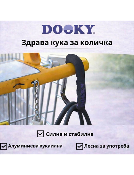 Семпла и практична кука от Dooky Original, на която може да закачите своите неща, като чантата за бебешки аксесоари, пазарски чанти или раници, и да имате директен достъп до тях.