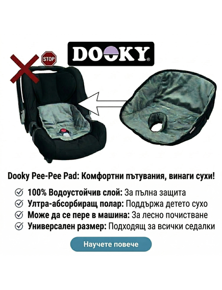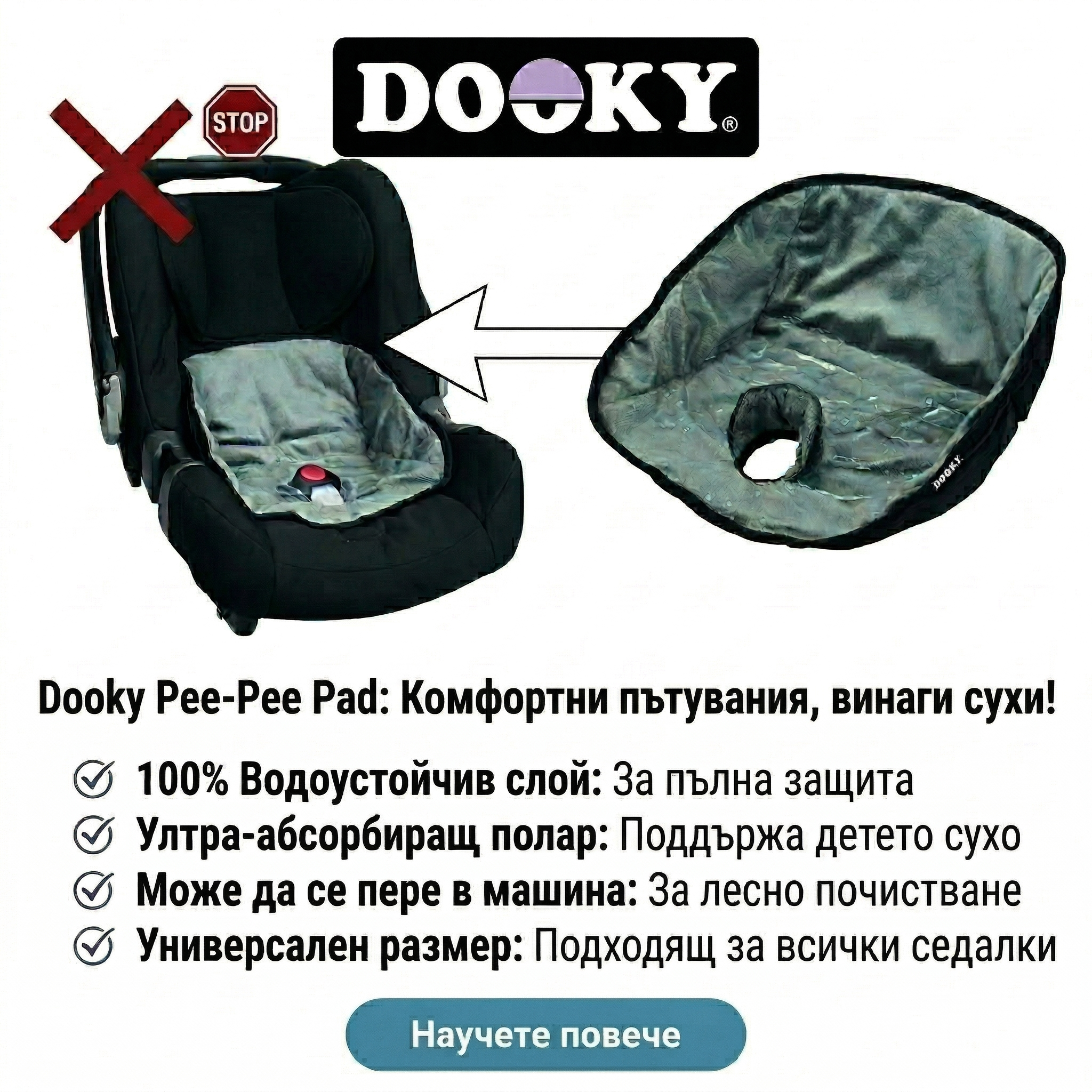 "Стигнахме ли? Пишка ми се!!!!" А, искаш ли гаранция детето да пристигне със сухо столче? Това е лесно постижимо с непромокаемата подложката на Dooky. Подвижната подложка пасва на всяка седалка за кола или бустер и абсорбира урината, когато е необходимо.
