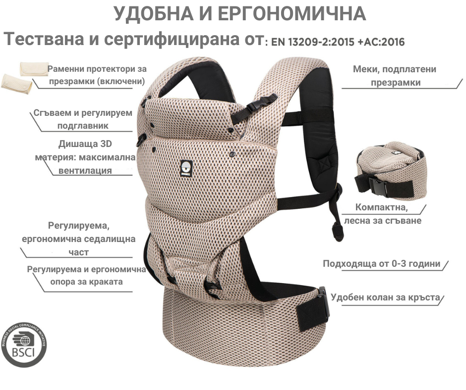 - Детето трябва да се носи с лице към Вас, докато врата на бебето не е достатъчно укрепнал ( около 5 месечна възраст)