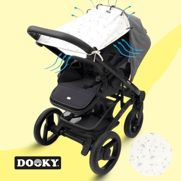 Благодарение на уникалния си дизайн, Dooky Original е лесно регулируем по височина. Просто го завийте и го залепете с велкро или го оставете надолу. С връзките в долната част можете да завържете сенника, за да сте сигурни, че той не е засегнатат от вятъра.