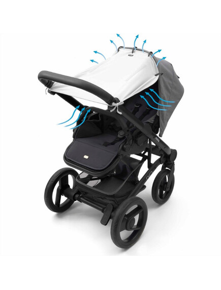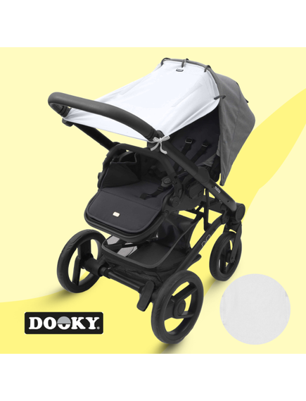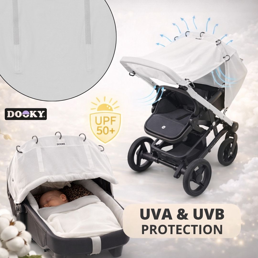 Точно за това UV сенникът на Dooky Original e отговорът. Изработен е от 100% памучна дишаща материя (която създава подходяща вентилация) със защита срещу слънцето UPF50 +, която блокира повече от 95% от вредните UVA и UVB лъчи и се смята за отличнa UV защита. Тяхната основна особеност са пръстените, с които много лесно се връзват на количката или на столчето за кола.