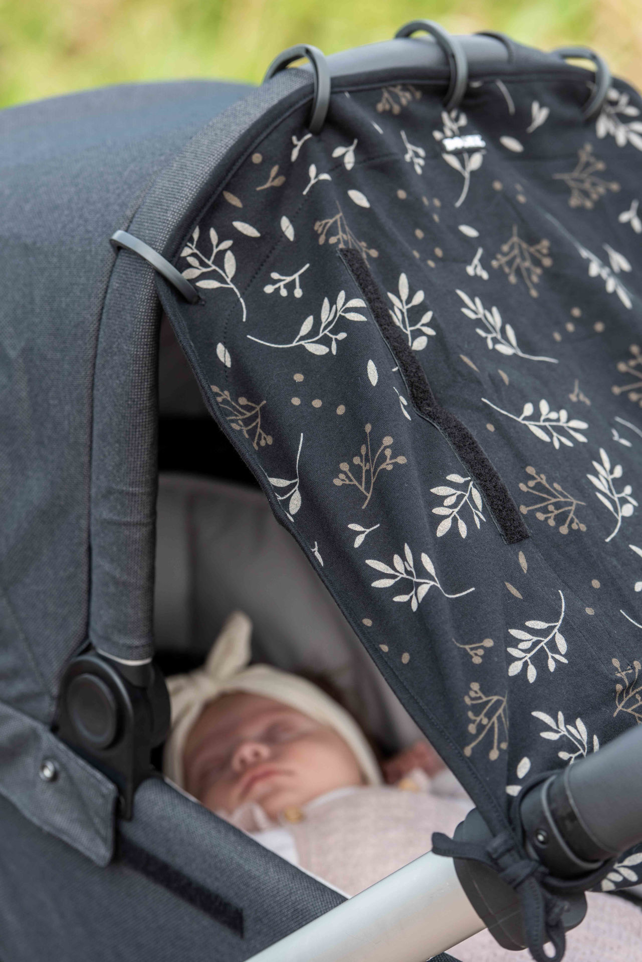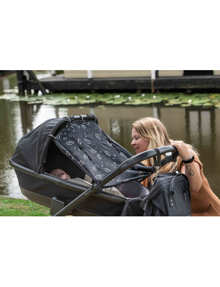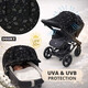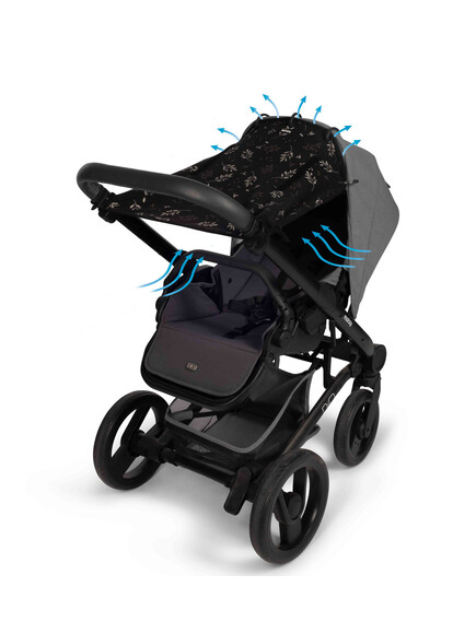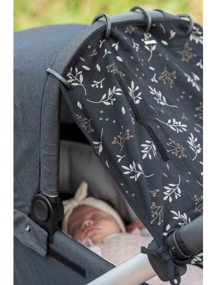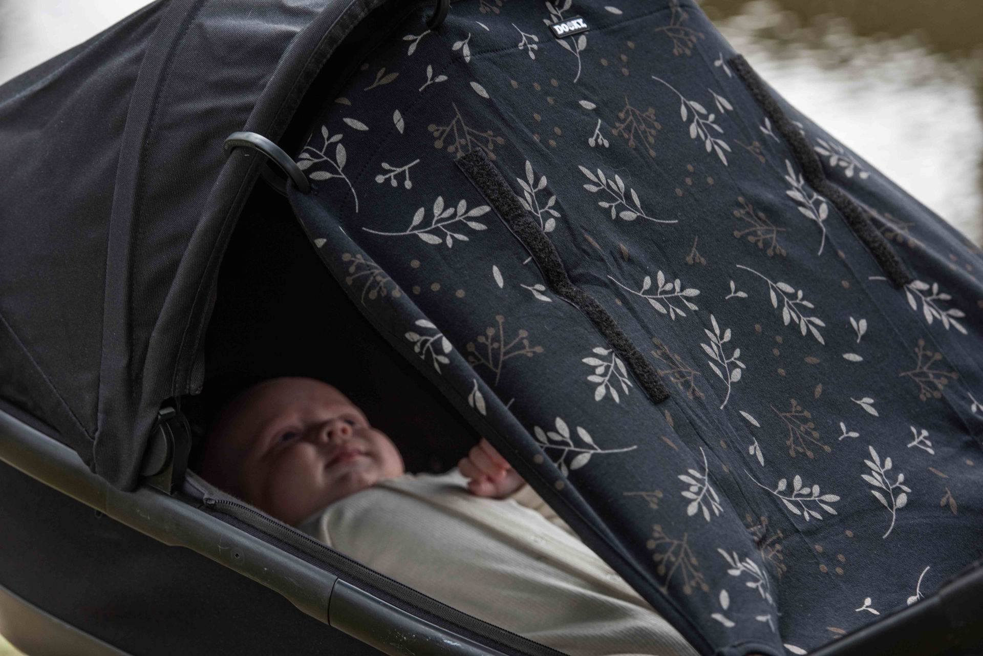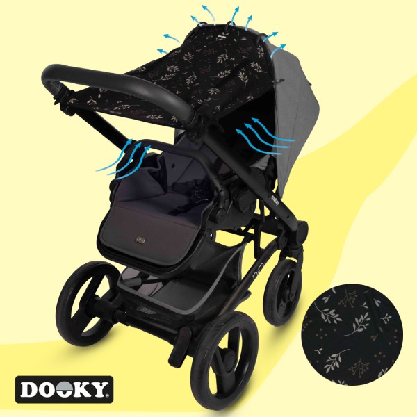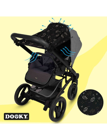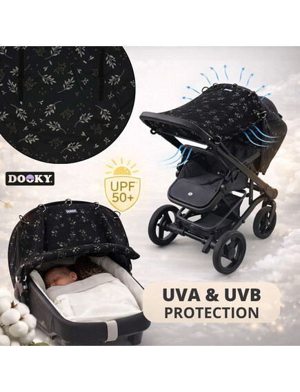 Точно за това UV сенникът на Dooky Original e отговорът. Изработен е от 100% памучна дишаща материя (която създава подходяща вентилация) със защита срещу слънцето UPF50 +, която блокира повече от 95% от вредните UVA и UVB лъчи и се смята за отличнa UV защита. Тяхната основна особеност са пръстените, с които много лесно се връзват на количката или на столчето за кола.