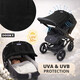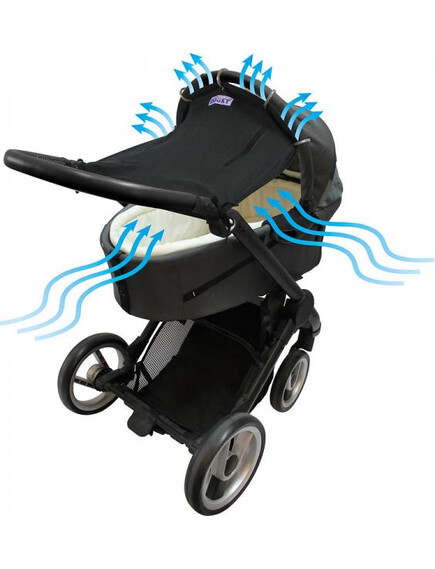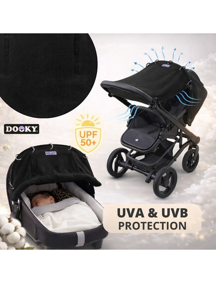 Точно за това UV сенникът на Dooky Original e отговорът. Изработен е от 100% памучна дишаща материя (която създава подходяща вентилация) със защита срещу слънцето UPF40 +, която блокира повече от 95% от вредните UVA и UVB лъчи и се смята за отличнa UV защита. Тяхната основна особеност са пръстените, с които много лесно се връзват на количката или на столчето за кола.