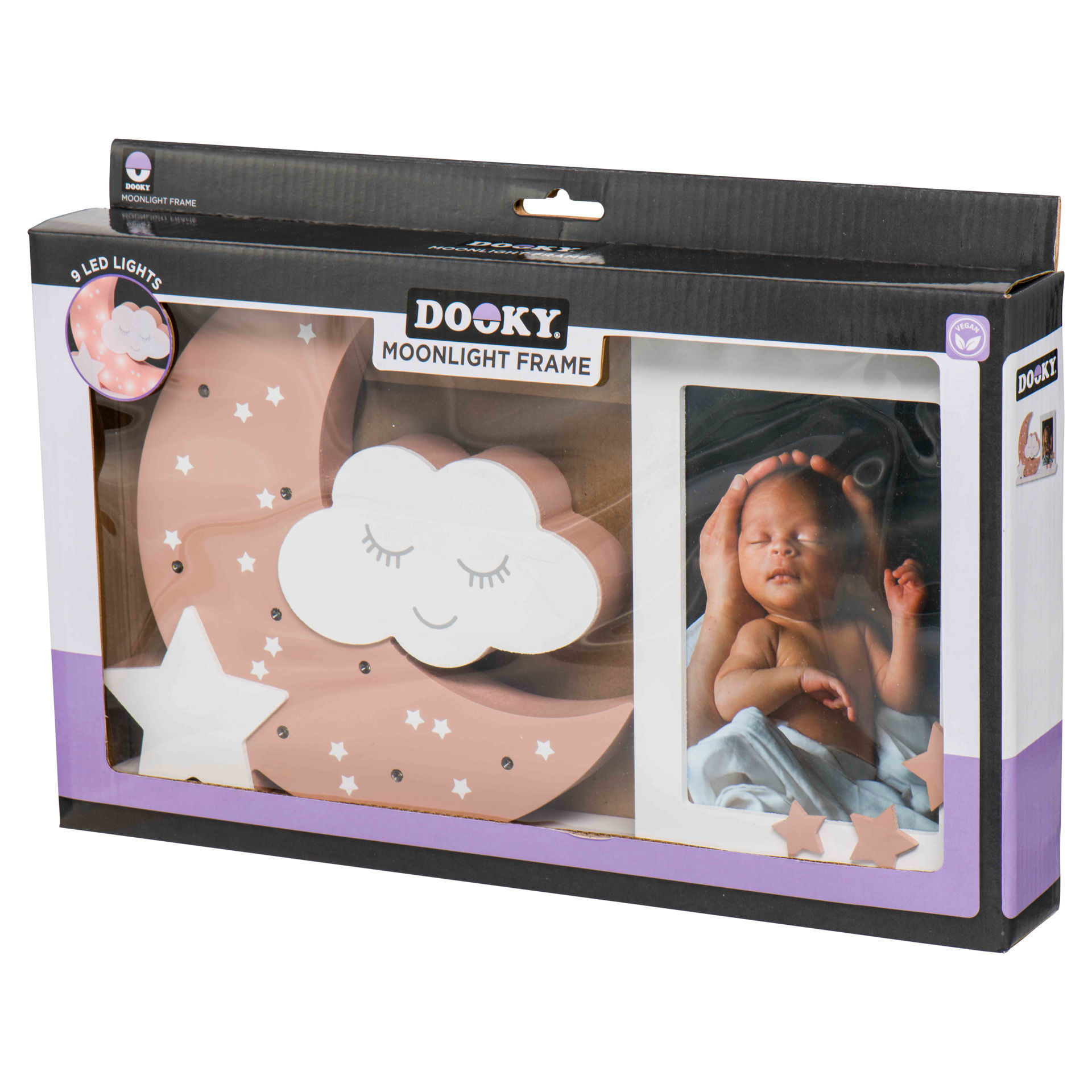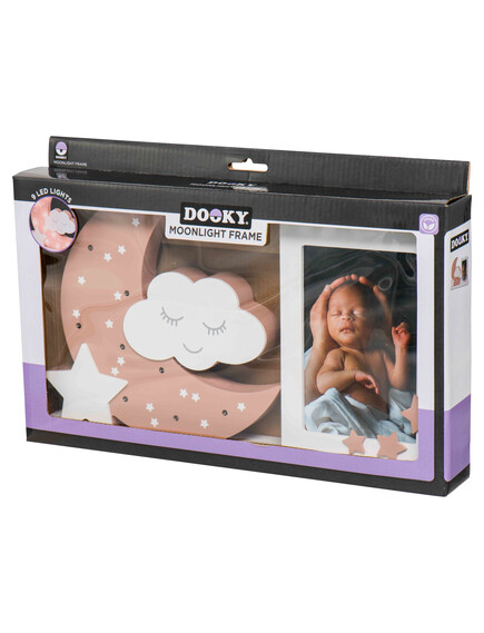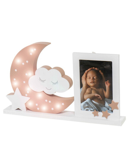 Фото рамката побира снимки с размери 10 х 15 см. Особеното при тази рамка за снимки е, че луната съдържа 9 малки LED светлини, така че звездите наистина да светят около вашето дете. По този начин с тази рамка за снимки Moonlight имате нещо като лампа, която разпръсква приказна светлина в стаята на вашето бебе или хола .