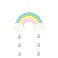 Дървена висяща играчка във формата на дъга, с висящи капчици.  Закачете го на люлата или стената, за да направи детската стая още по-уютна. Стойката за играчката е изработена от дърво и се продава отделно. Размери : В опаковка: 20 * 2 * 30 см, ...