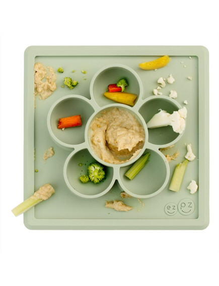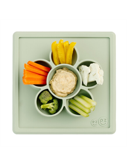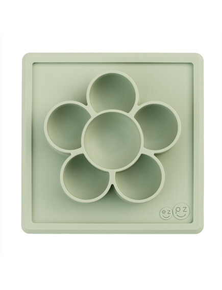 Силиконова чинийка за храна и игра с вградена вакуумна подложка във форма цвете Play Mat на Ezpz е "всичко в едно"! Тя залепва за масата чрез вакуум, позволявайки на децата да рисуват, да играят с мъниста, да събират всичките си материали на едно място. Чинийките са хипоалергични. По тях НЕ се задържат бактерии и мухъл и силикона не се износва. Изработени са БЕЗ вредните пластмаси BPA, BPS, PVC и фталати.