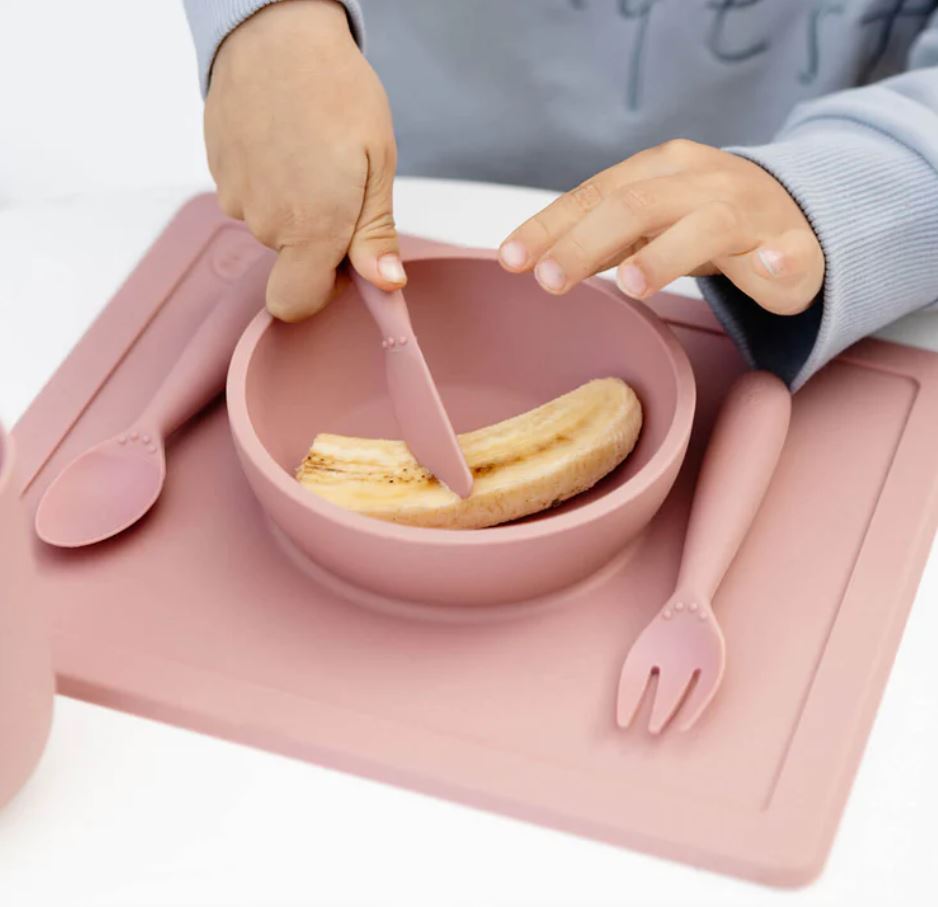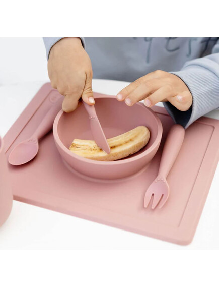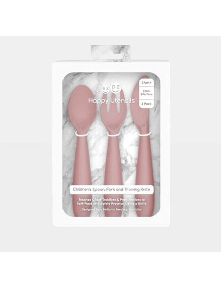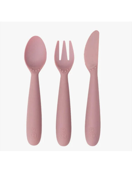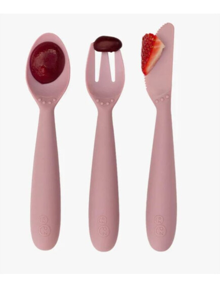 Ezpz Обучителен комплект за хранене - лъжица, вилица и нож създадени от педиатър специалист по храненето и подходящи за ЗВБ - Happy 24+ месеца - Blush